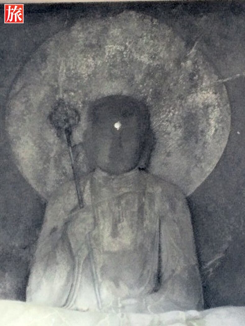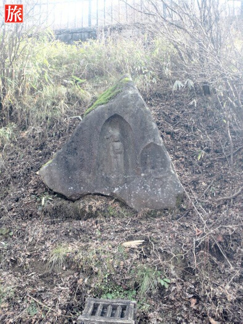 精進池の近くにある磨崖仏で、三角形の岩の中央に龕をうがち、地蔵菩薩立像を表す。