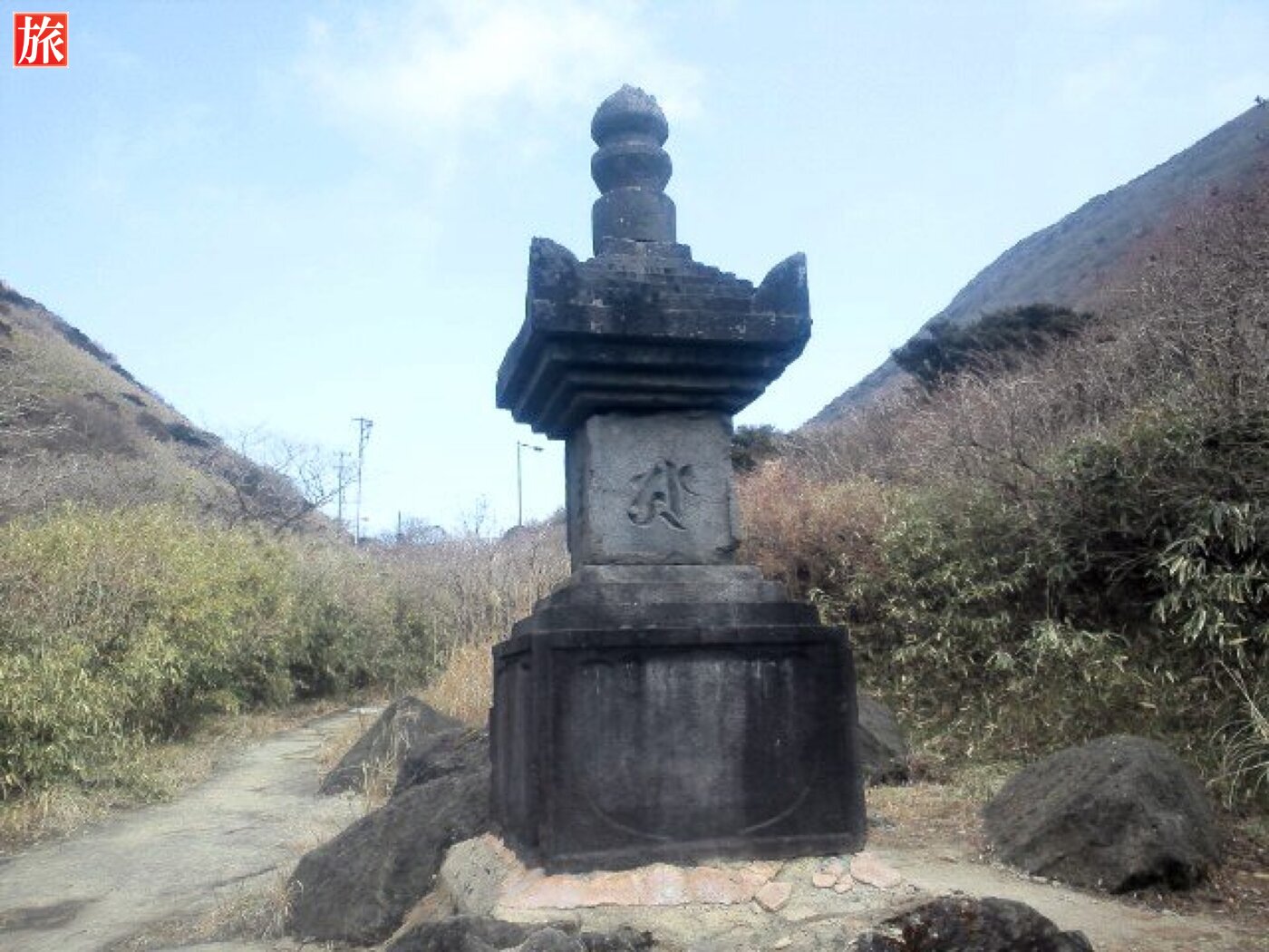 応長地蔵から芦の湯方面に進んだところに立つ、多田満仲の墓塔と伝承される石造宝篋印塔。