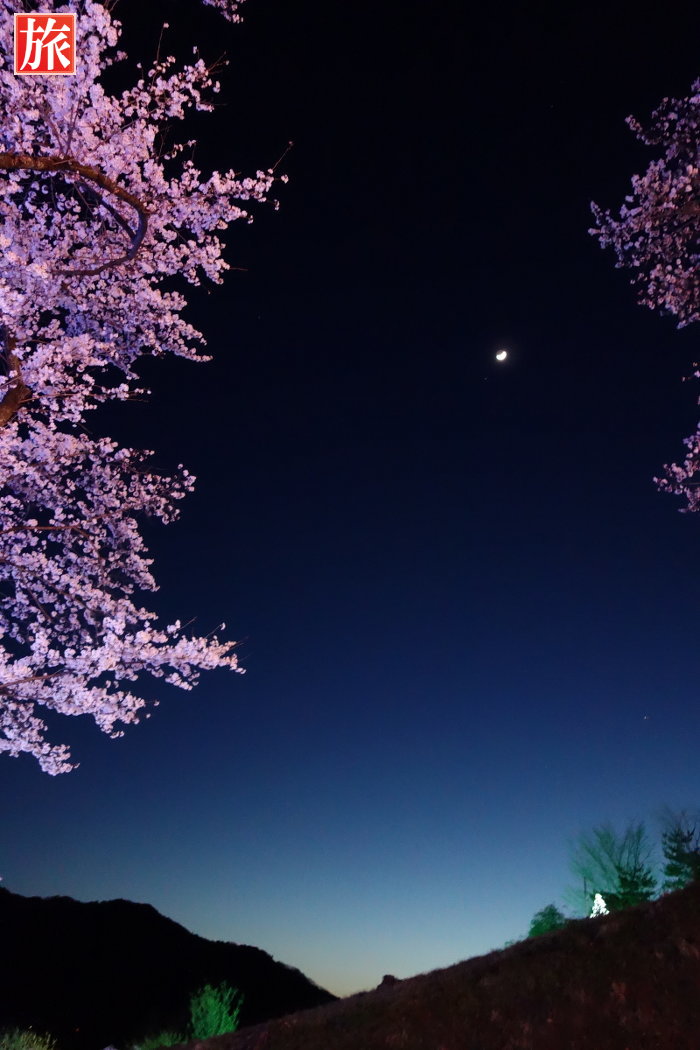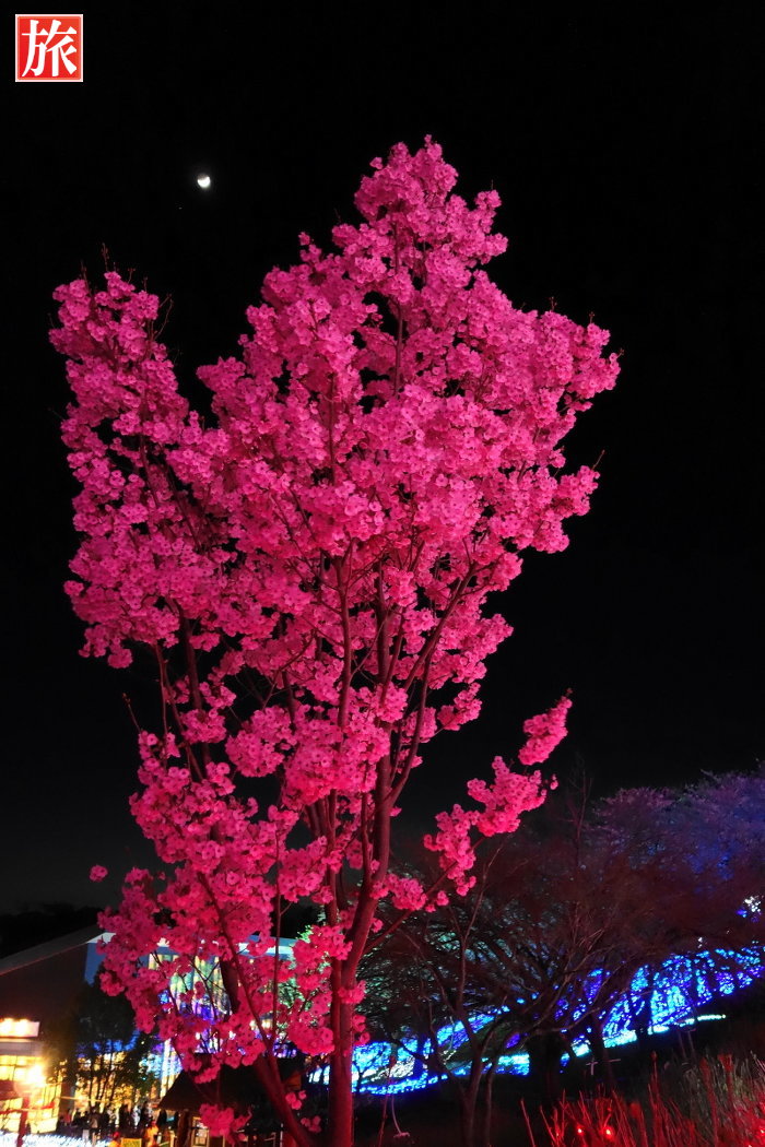 夜空に月と満開の桜がロマンチップ。光のトンネルも去年よりスケールアップし長くなったように感じられました。
