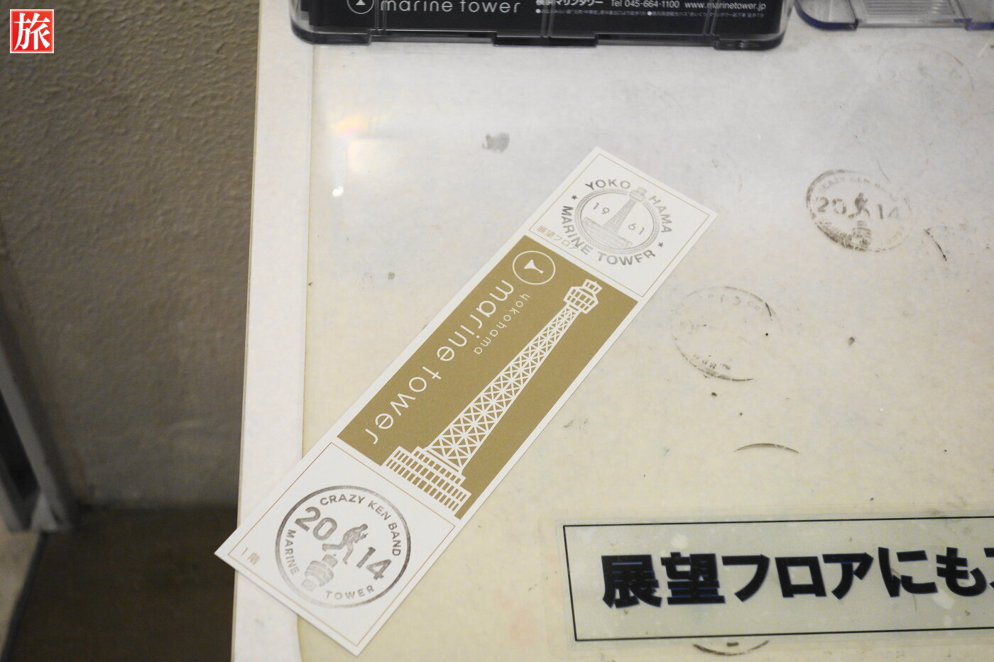 エレベータからの風景(下り)2Fの「マリンタワーショップ」。記念メダル発売機。記念スタンプ