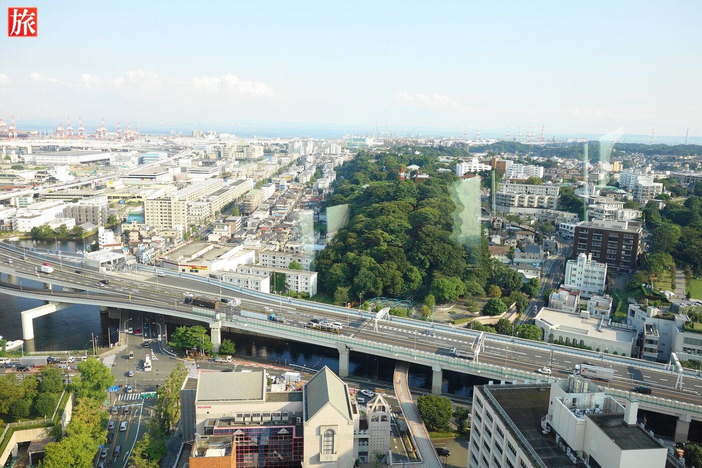 エレベータからの風景(昇り)高さ91m地点にある2層の展望台から眺めたベイブリッジ。山下公園内の南側にある「水の階段」を眺めた様子。氷川丸を眺めた風景。