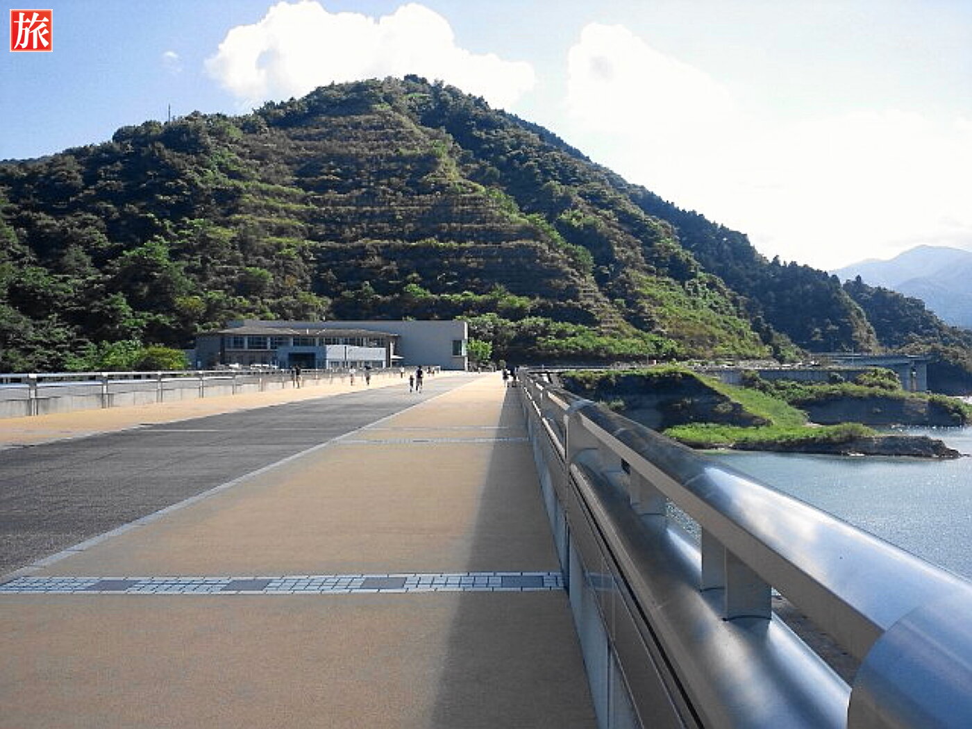 インクライン(ダムを建設するために使われた施設で、完成後はダムの上下を結ぶケーブルカーとして活用されています)が走っています。ダム上のエレベータ乗り場。