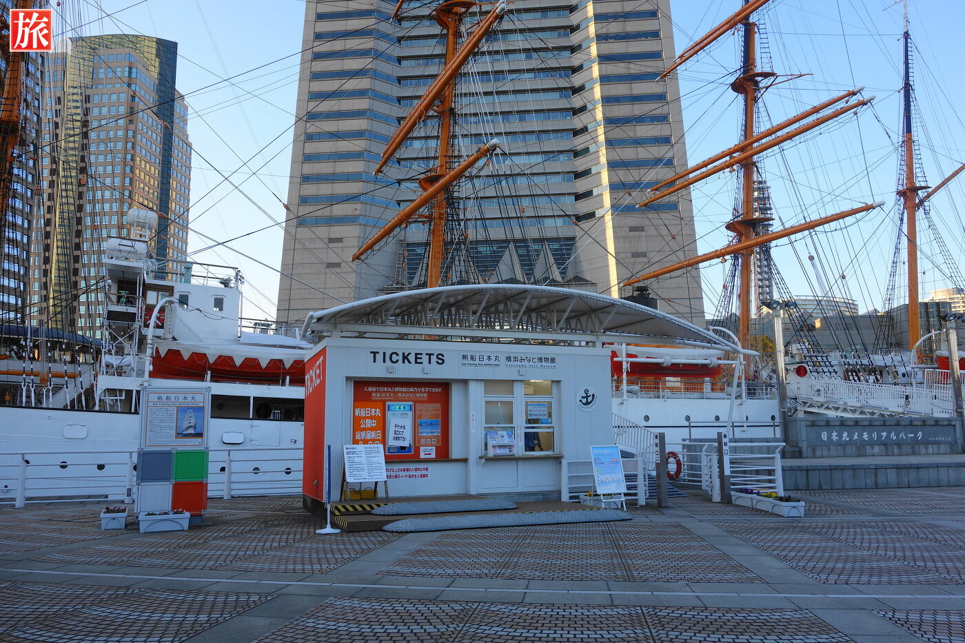 日本丸と隣には横浜ランドマークタワーがそびえ建ちます。入場チケット売り場。
