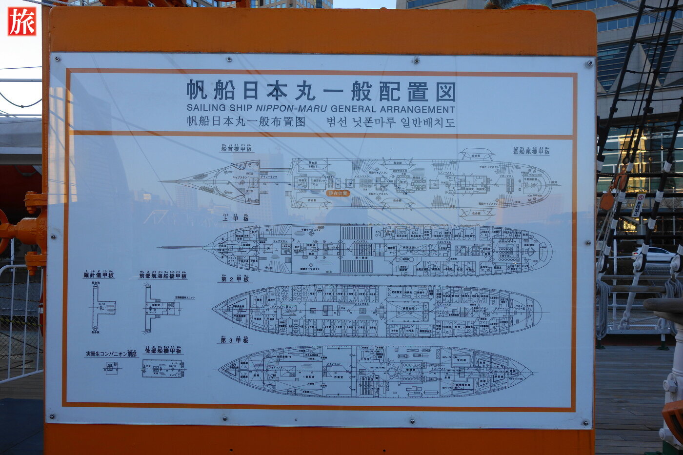 帆船日本丸・横浜みなと博物館の入館券。共通で大人(高校生以上)一人600円。帆船日本丸一般配置図。日本丸防災センター(警備員室)内の様子。