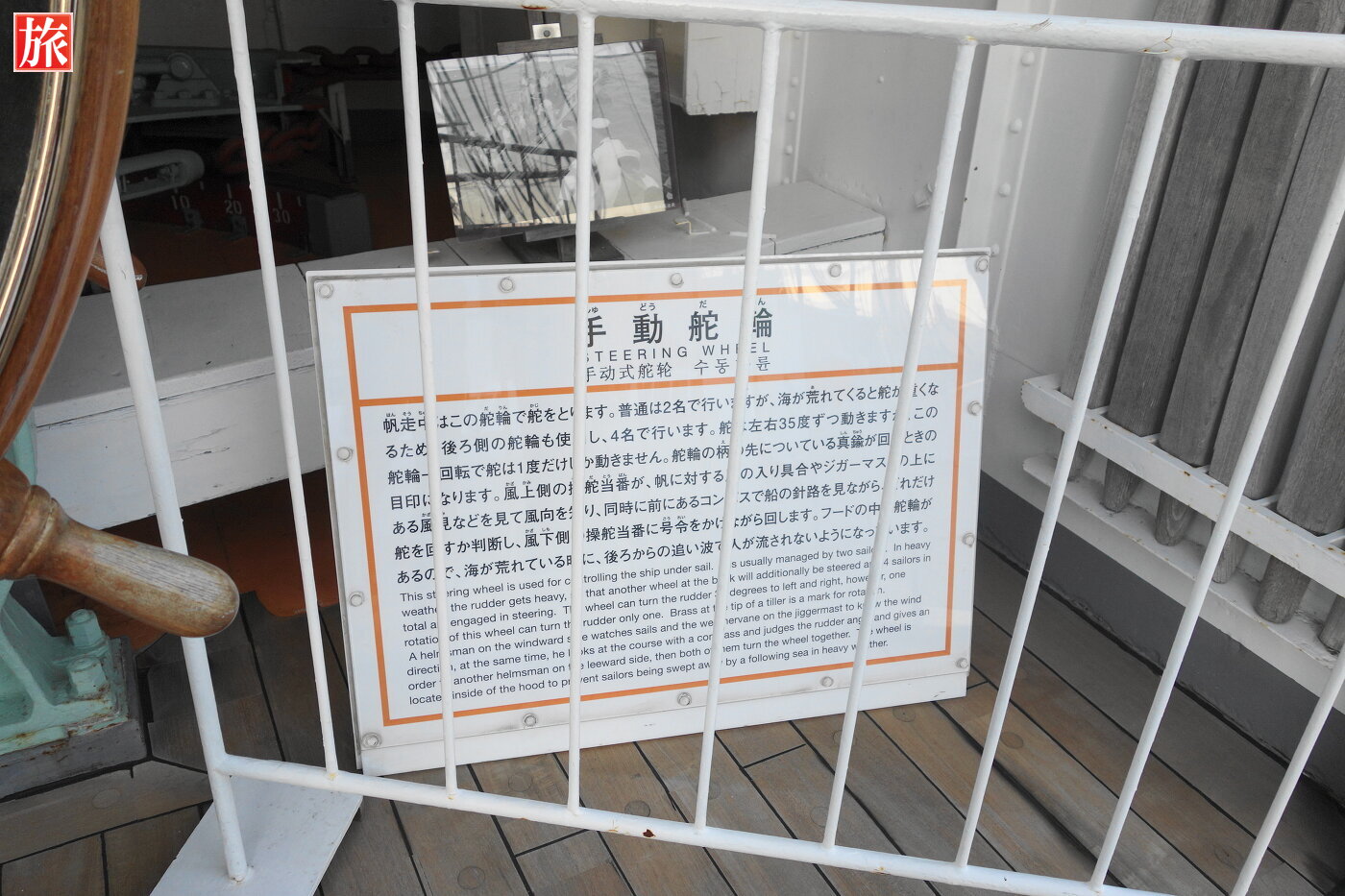 操舵室内の様子。操舵室付近から木甲板を望む。船首方向。大観覧車「コスモクロック21」方向。