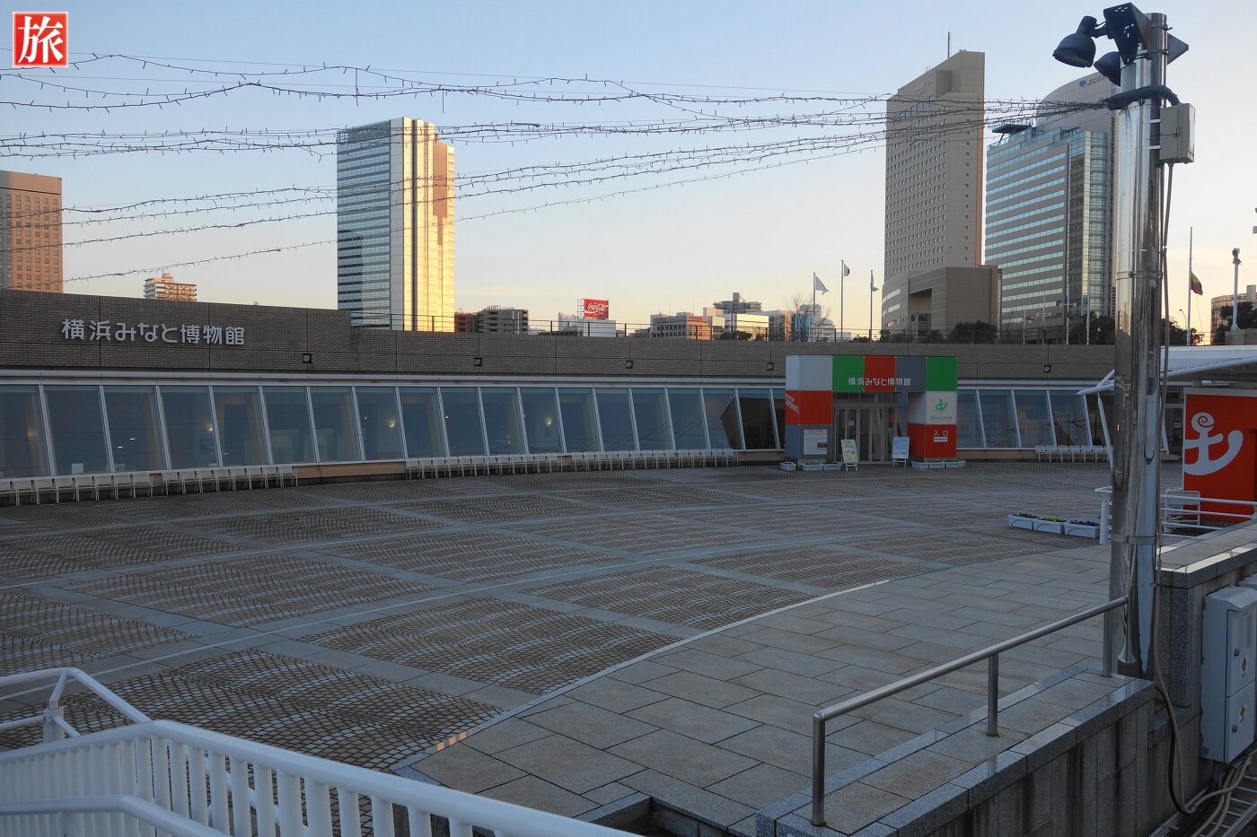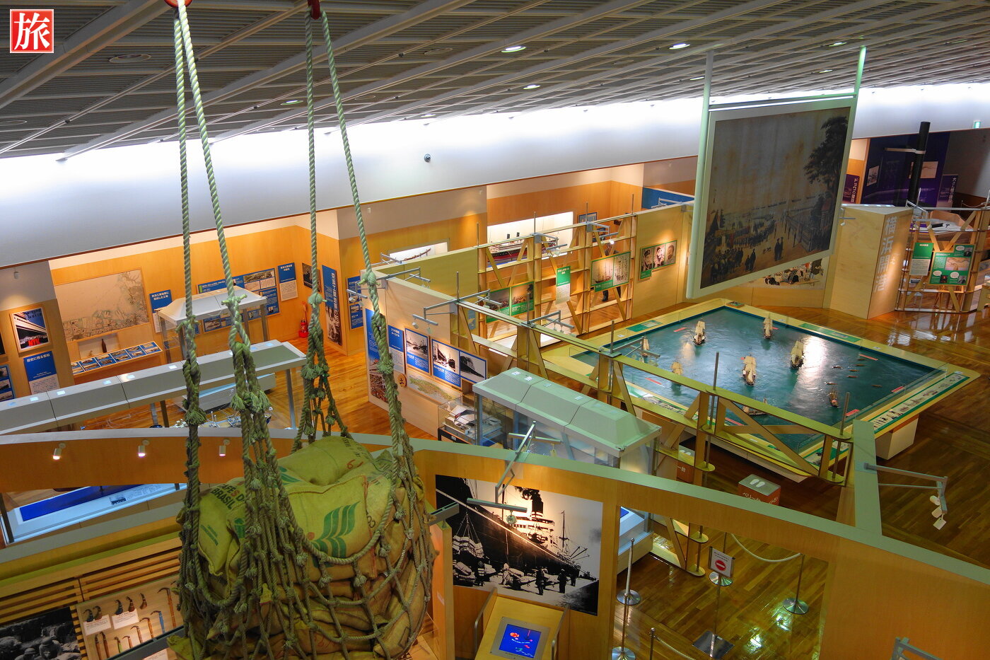 日本丸の甲板から見た横浜みなと博物館。横浜みなと博物館(旧 横浜マリタイムミュージアム)入口。内部1階フロアの様子。