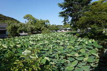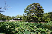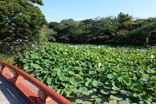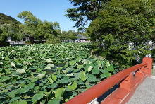 鶴岡八幡宮境内にある源平池は、本宮に向かって右が源氏池、左側が平家池で、純白や真紅のハスが妖艶な花を咲かせる。