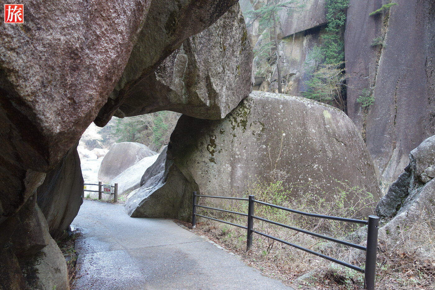 少し下流に下ると巨大な花崗岩に囲まれた「石門」が現れます。先端がわずかに離れ今にもくっきそう・・石門付近から岩肌を見た風景。
