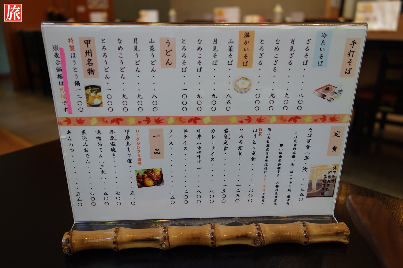 お座敷から見えた荒川沿いに咲く枝垂桜。食事メニュー。「B1グランプリ優勝」の甲府鳥もつ煮(520円)と「甲府名物」特製ほうとう鍋(1200円)を注文