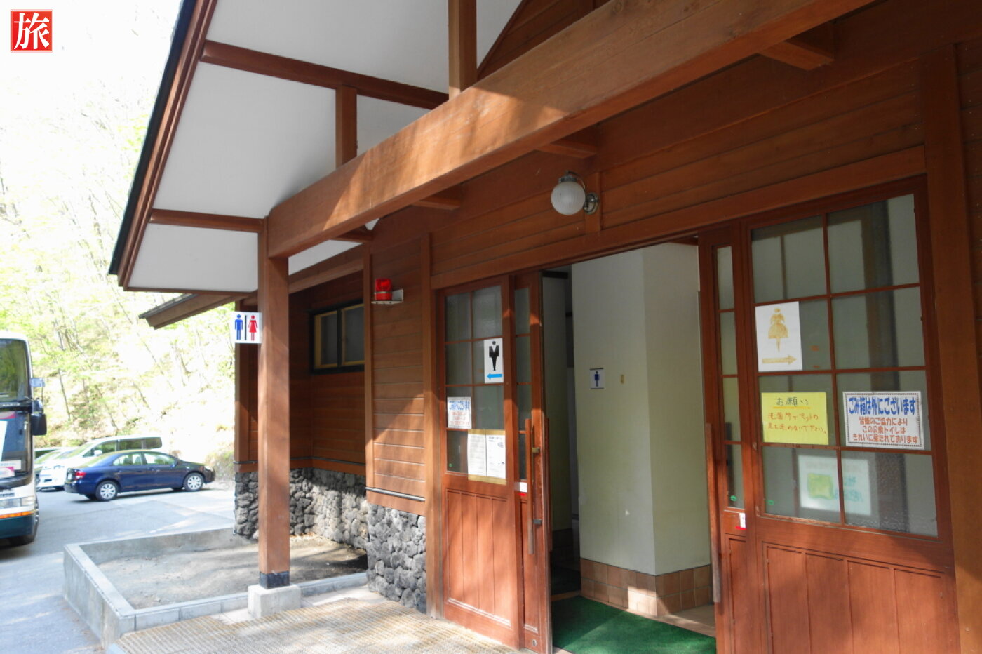 白糸の滝入口付近にある案内板。お食事処。町内観光案内図。道路沿いにある公衆トイレ。