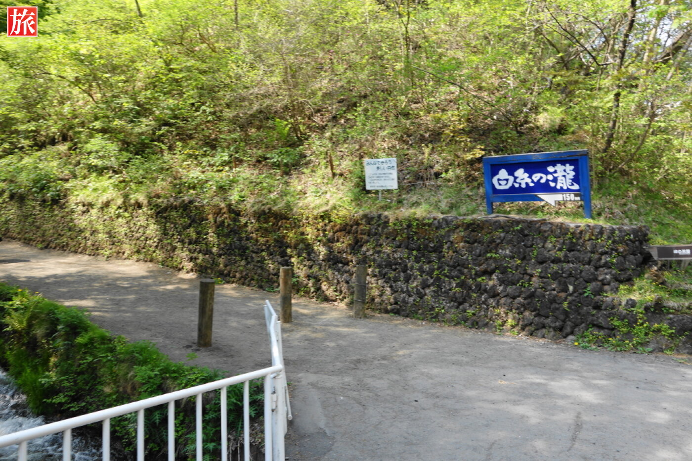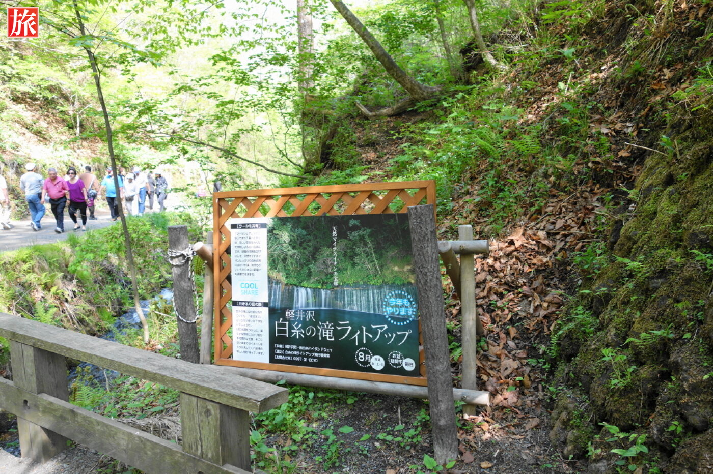ライトアップ案内の看板。橋を渡ると清流は右側に。 白糸の滝、直ぐ下流にある人工の段瀑。