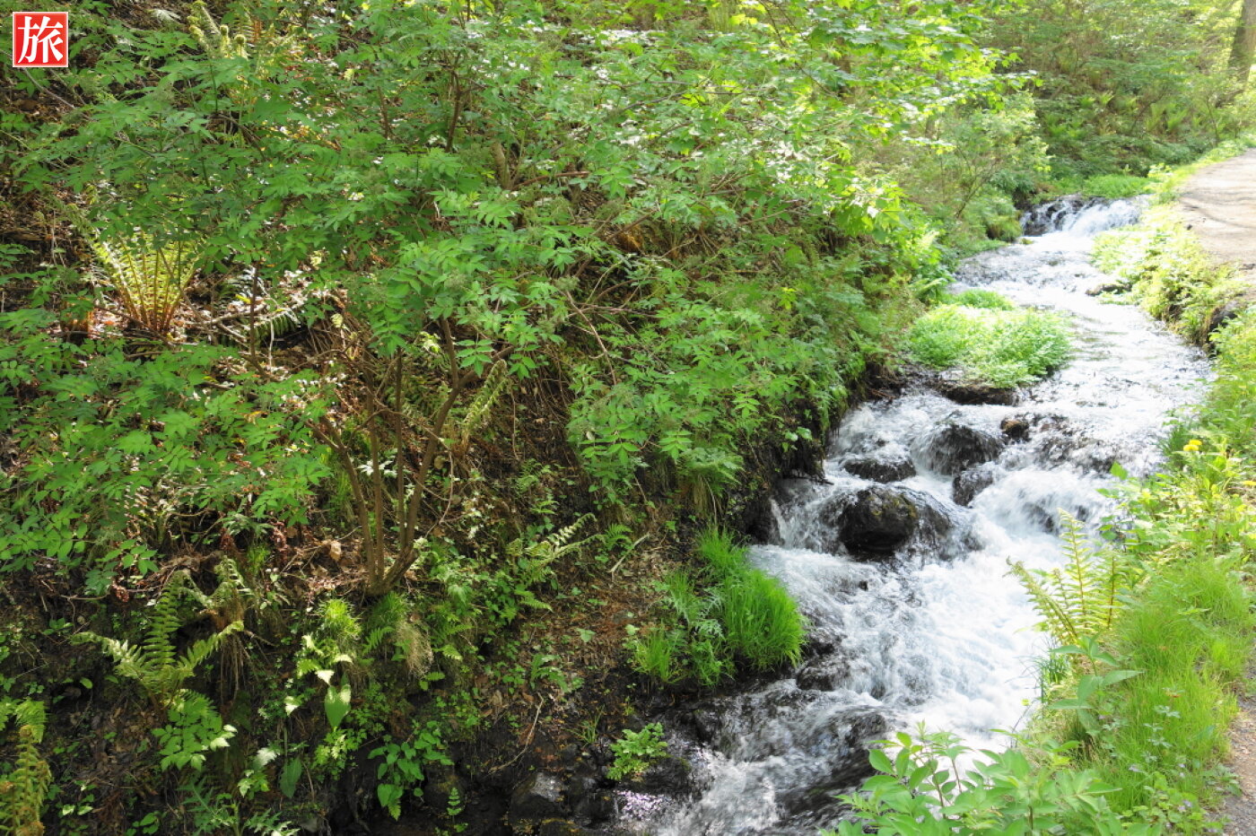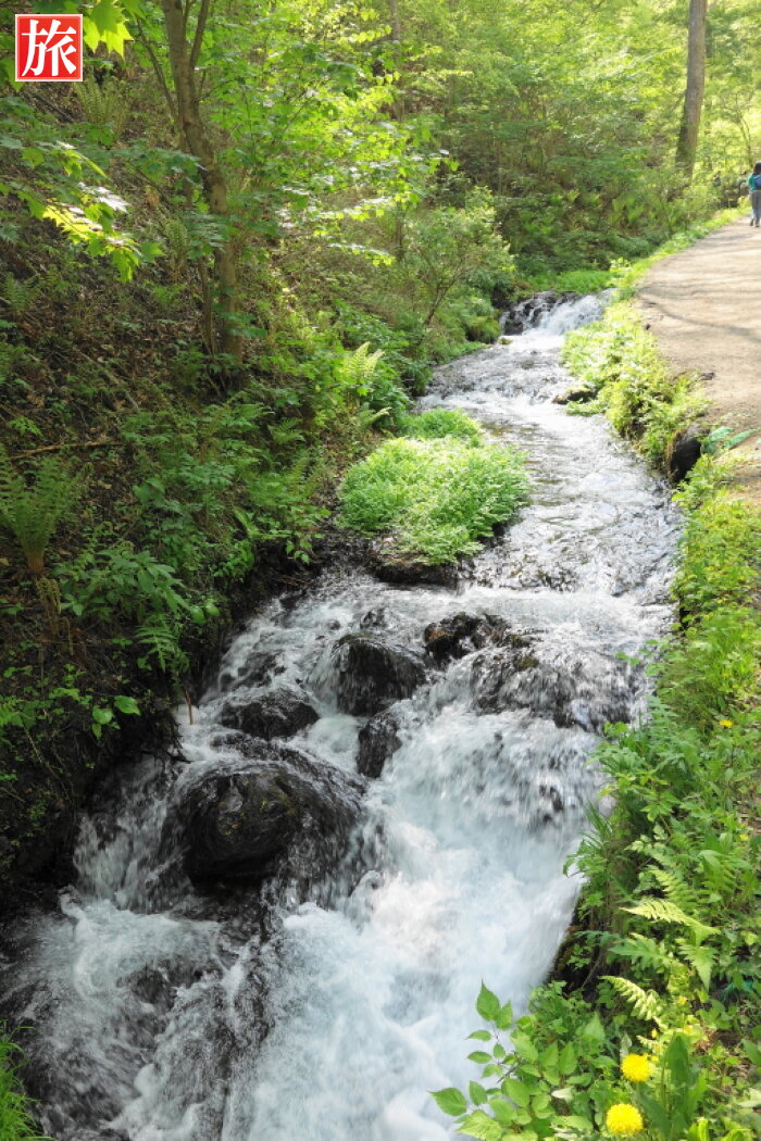 白糸の滝入口、ここから約150m。入口を入りすぐ左手に流れる清流。左手に流れる清流。