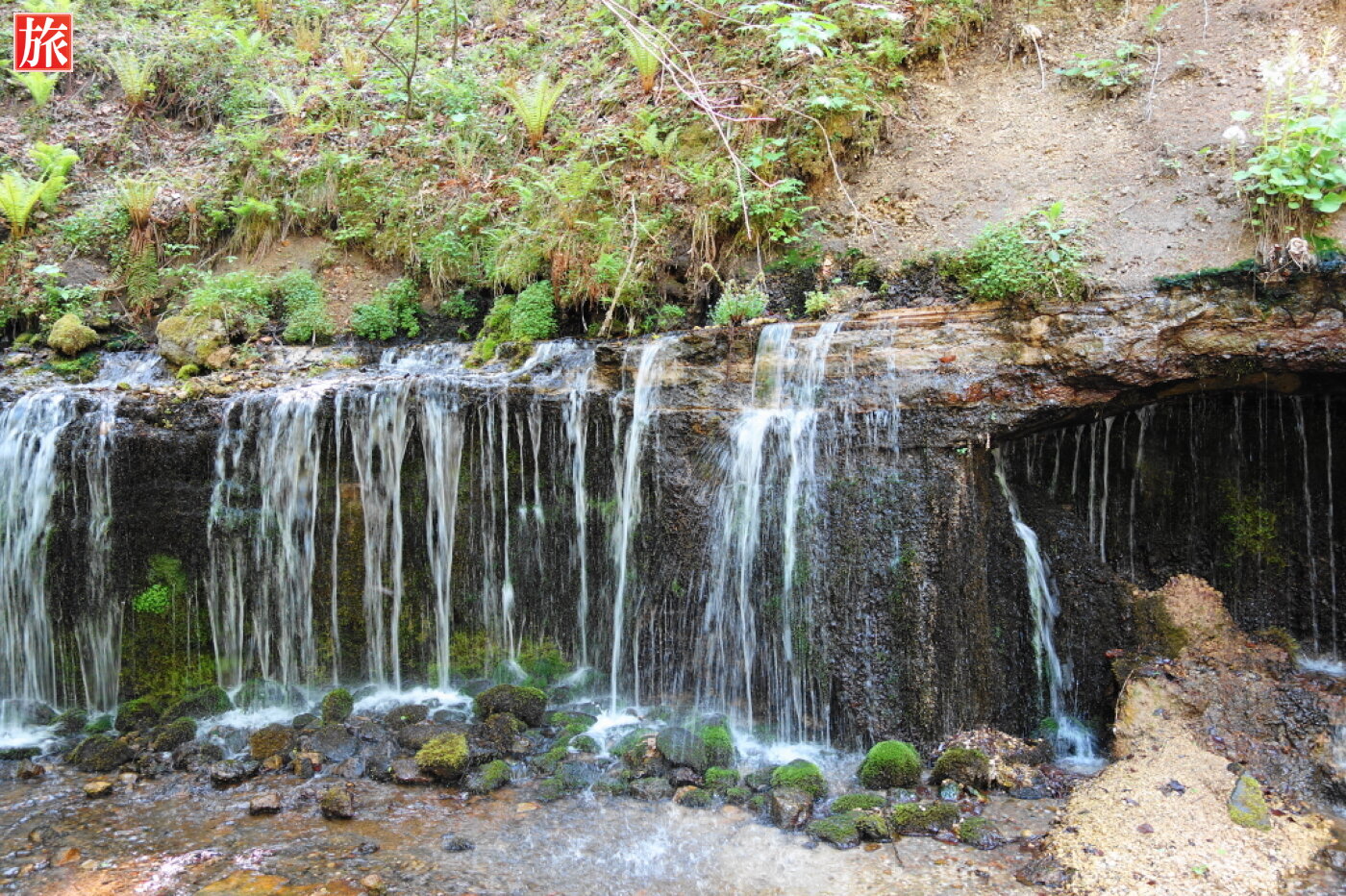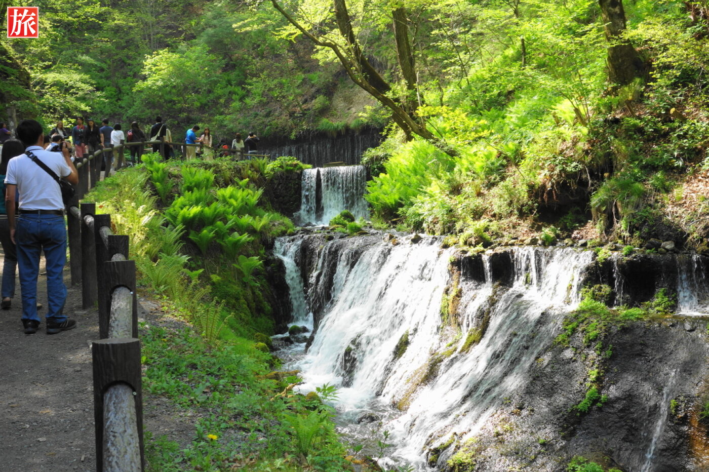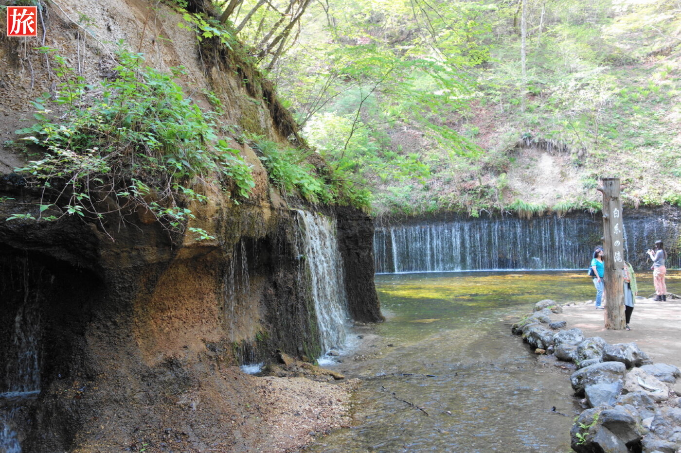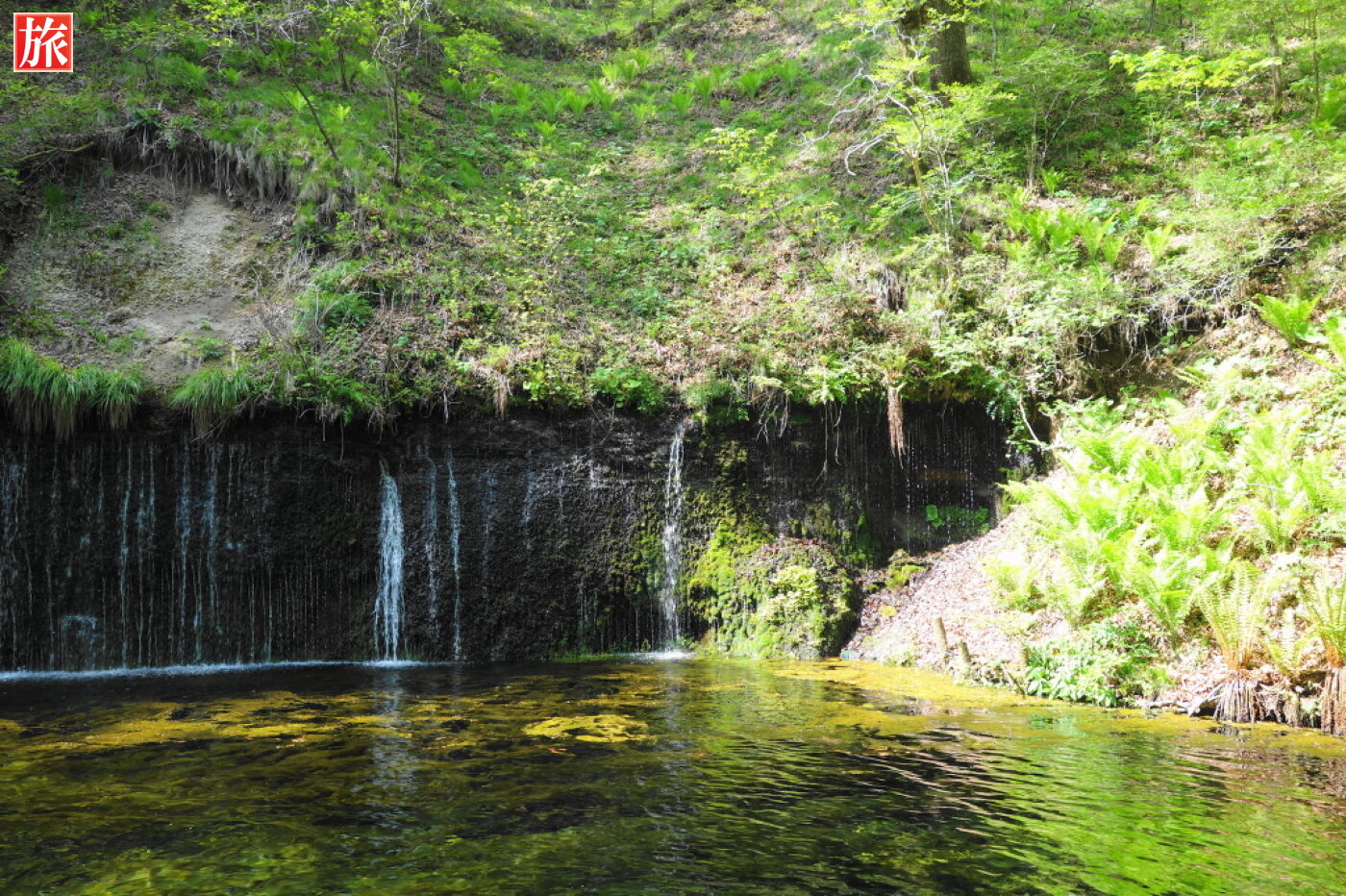 白糸の滝神秘の森の中、湾曲した岩壁に浅間山の伏流水が白糸のように落ち、清涼感に包まれ心地いいマイナスイオンを充電。高低差は約3メートルで横幅がおよそ70メートルのカーテン状の滝。滝の流量は通年ほぼ一定で雨の後でも水が濁らないとのことです。