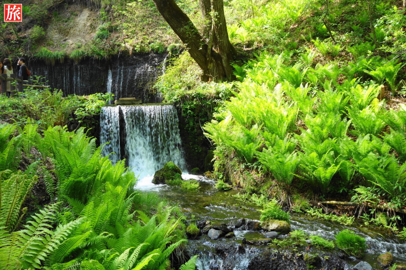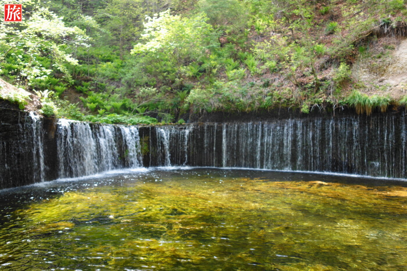 滝壺状の池から流れ込む様子。新緑が美しい。瀧の右側。