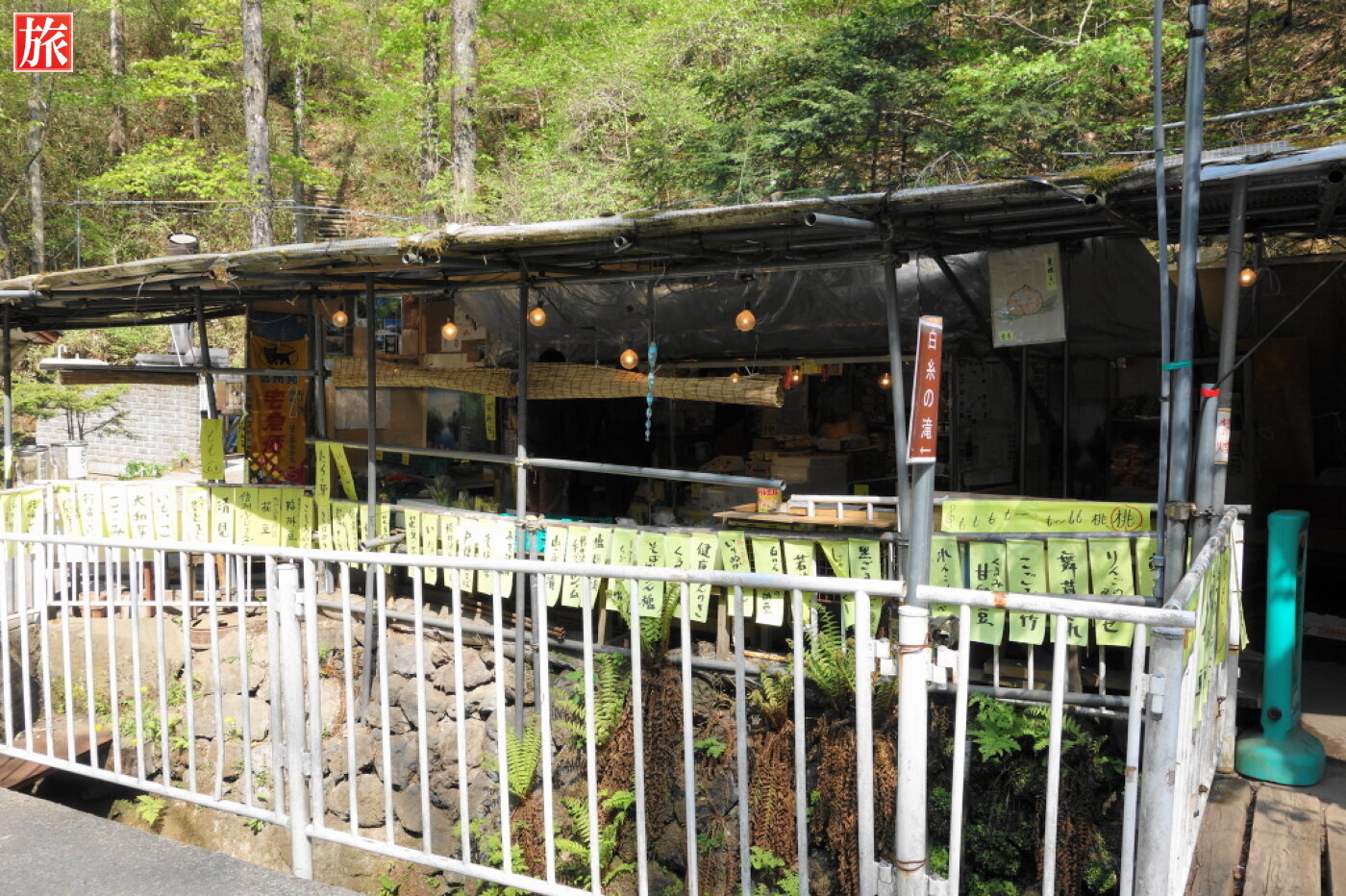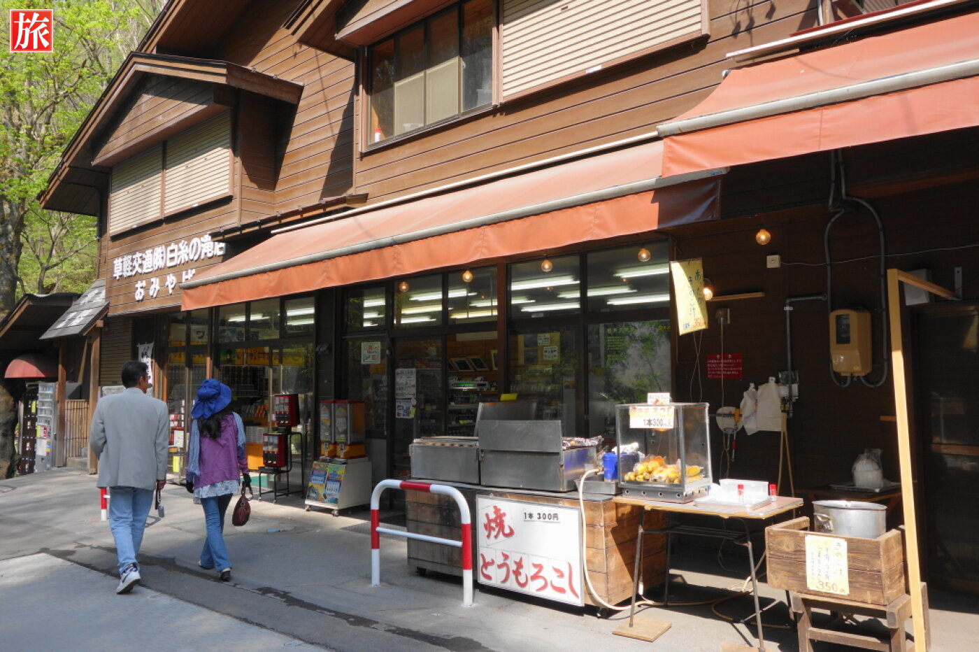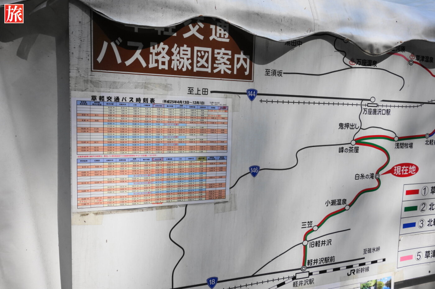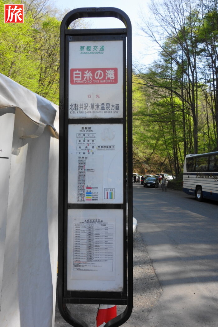 白糸ハイランドウェイ、白糸の滝付近。道路沿いのお土産屋。バス路線図案内板と停留所(北軽井沢・草津方面)。