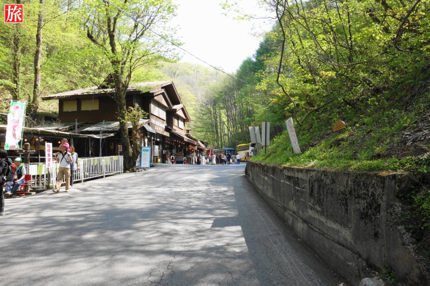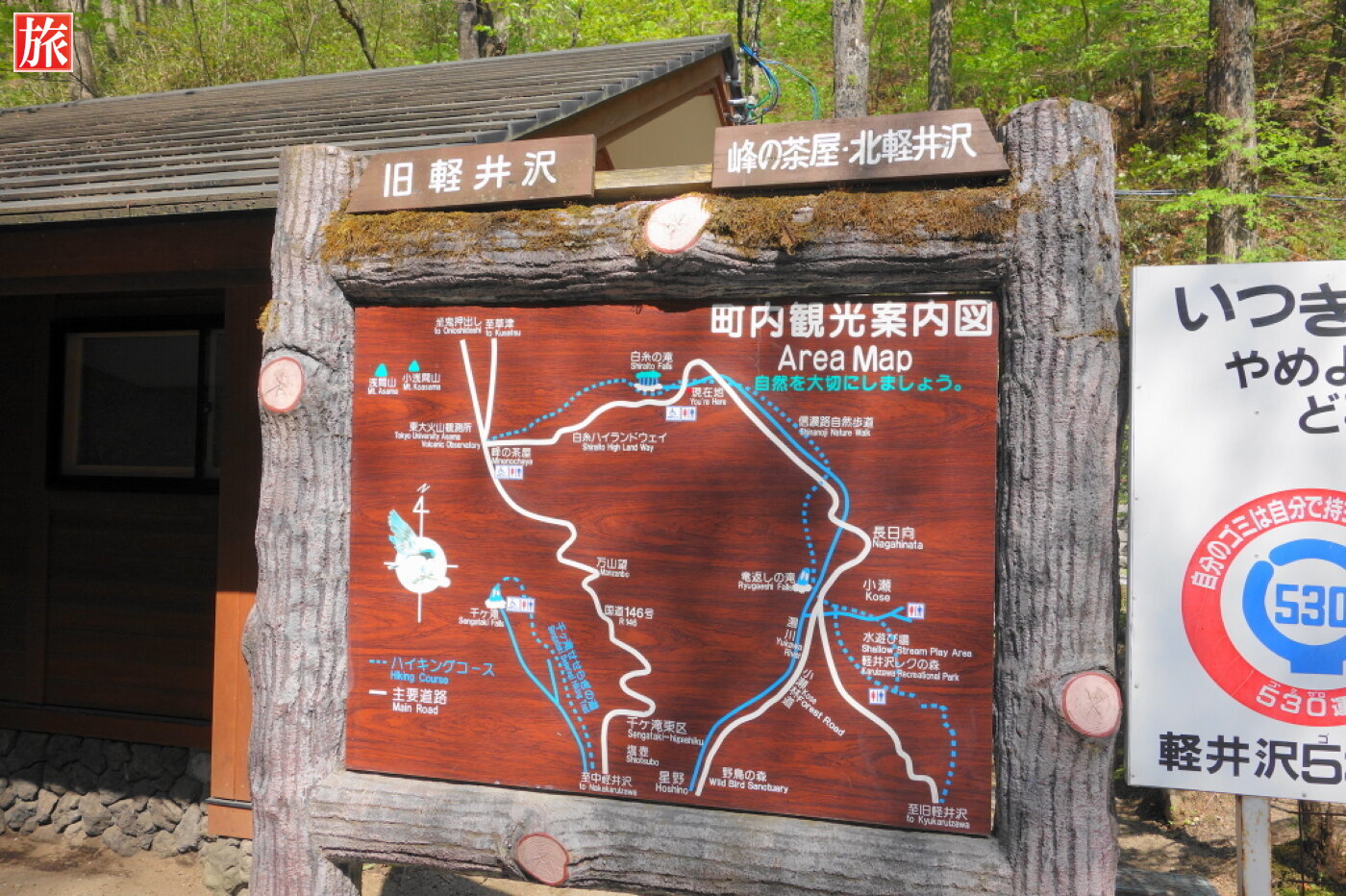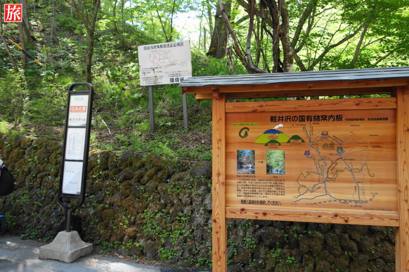 白糸ハイランドウェイ、白糸の滝付近。道路沿いのお土産屋。バス路線図案内板と停留所(北軽井沢・草津方面)。