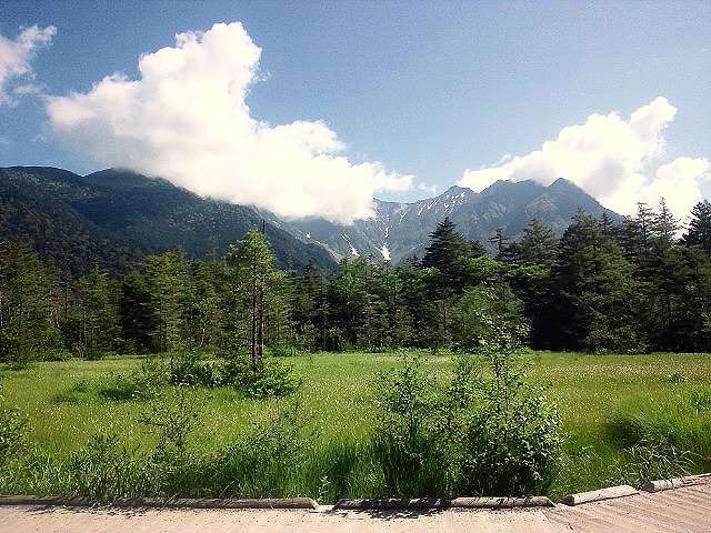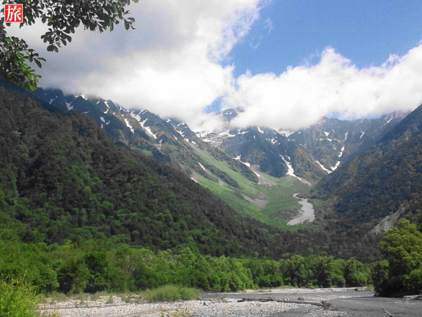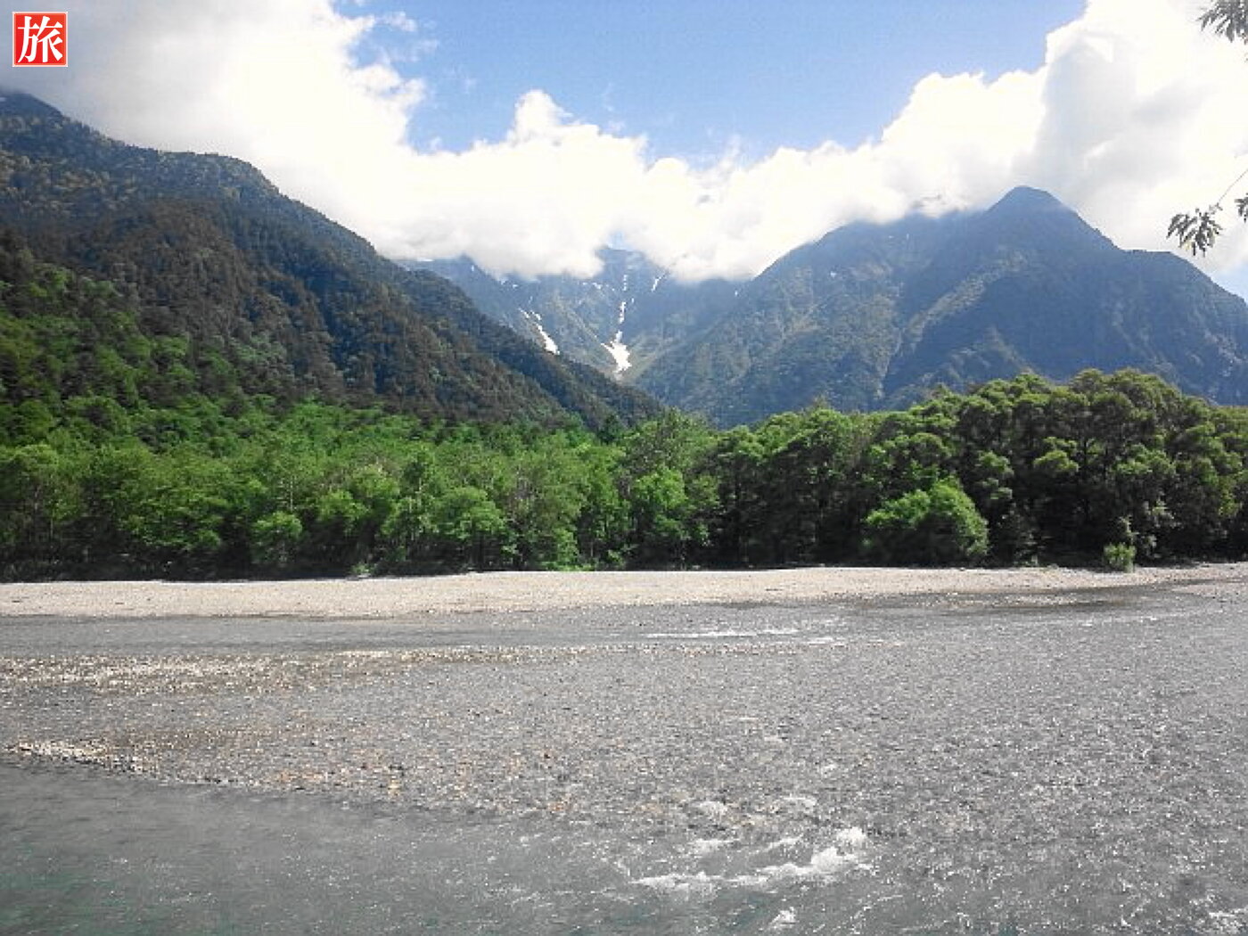 さらに梓川を上流に向かいます。青空と雲にかかる山々。穂高岳方向の風景。