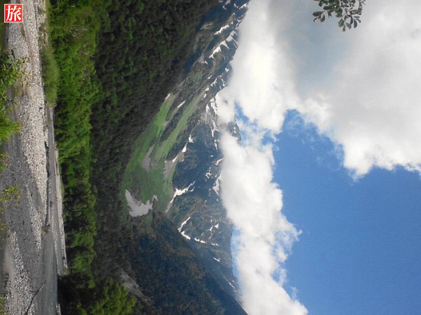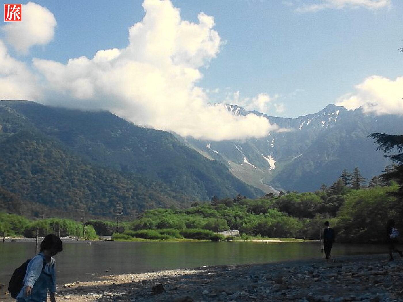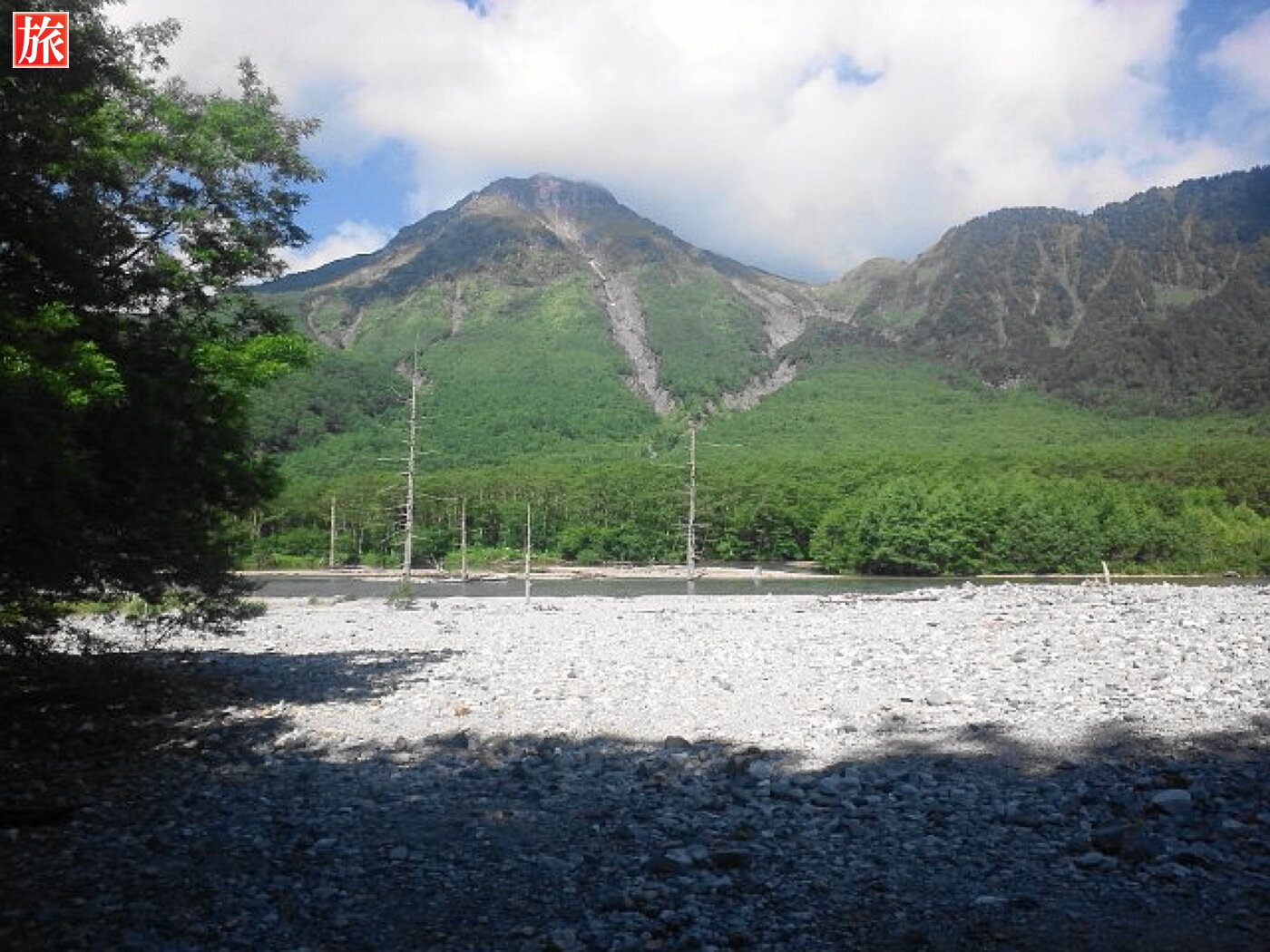 さらに梓川を上流に向かいます。青空と雲にかかる山々。穂高岳方向の風景。