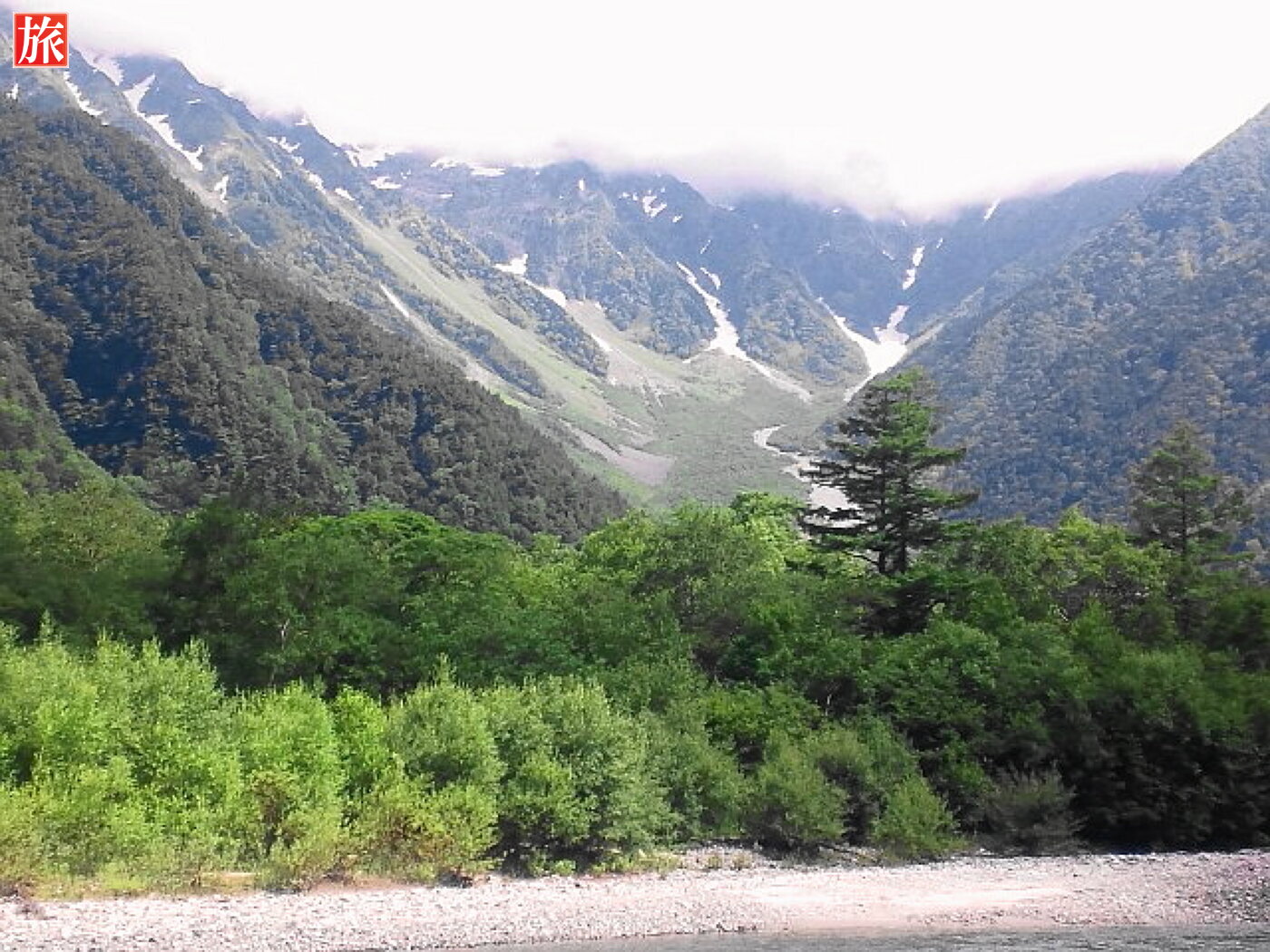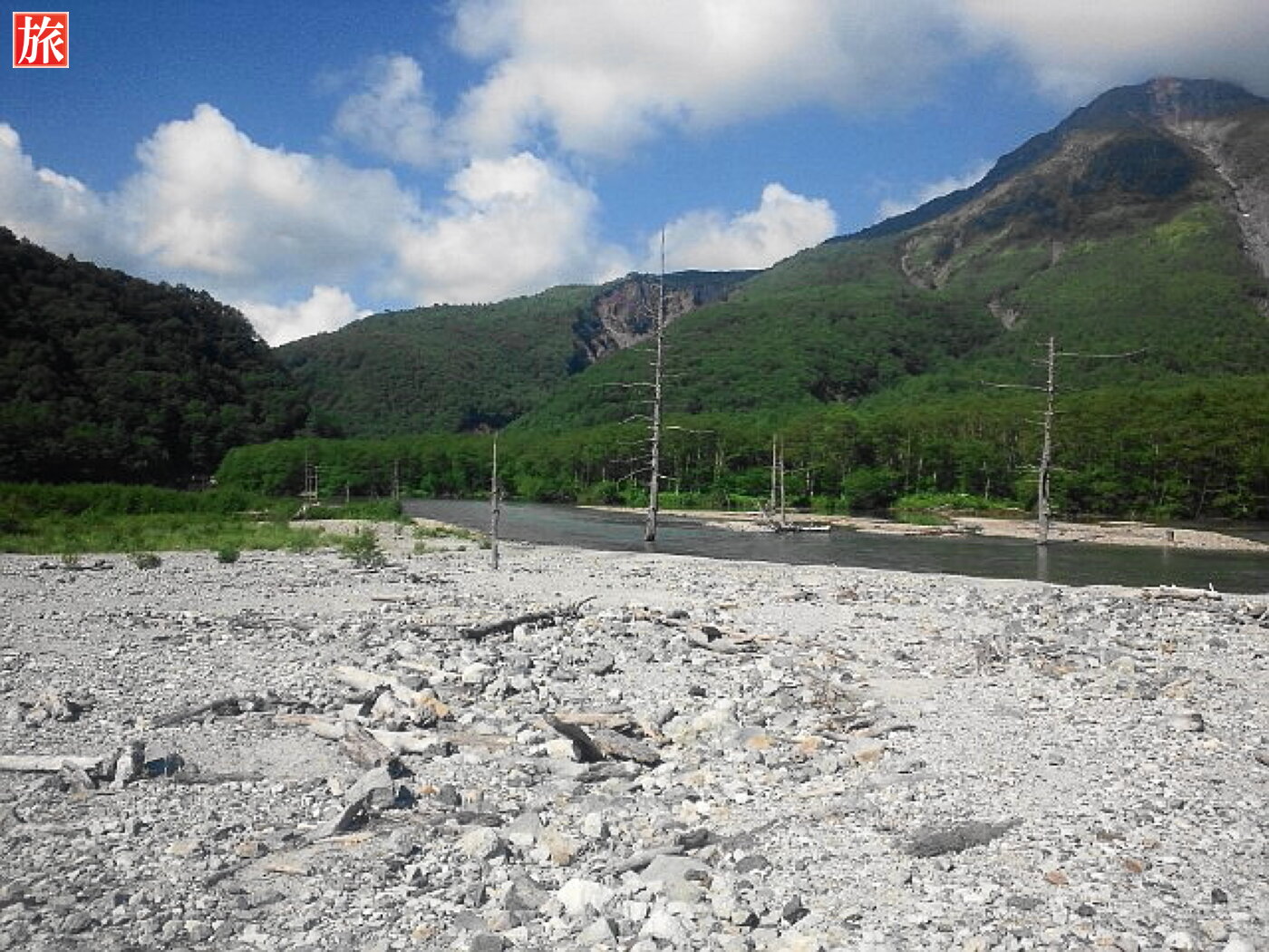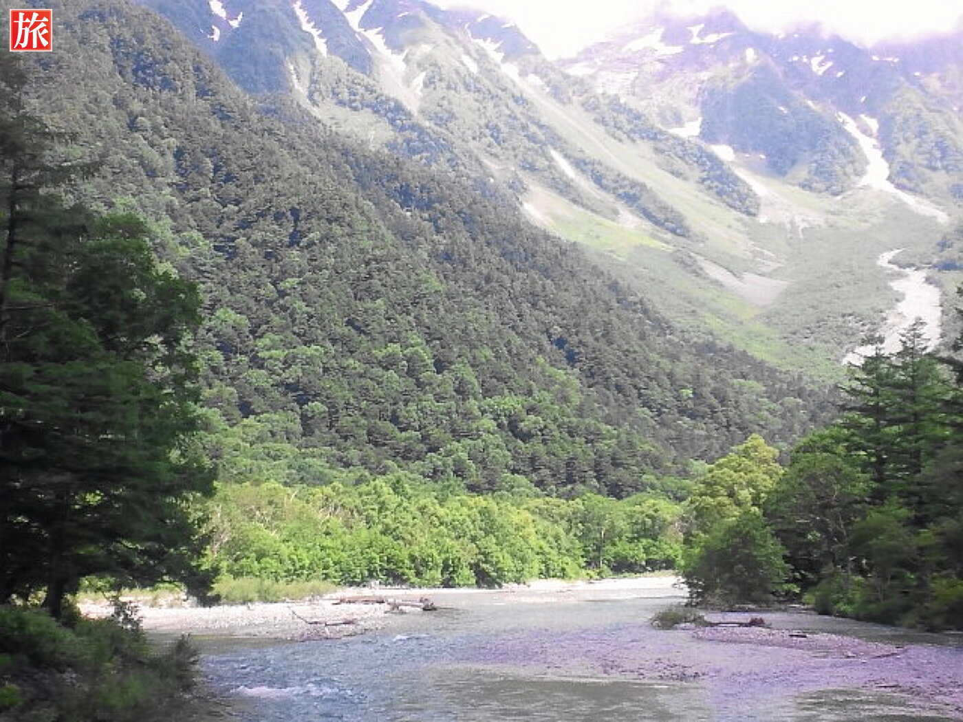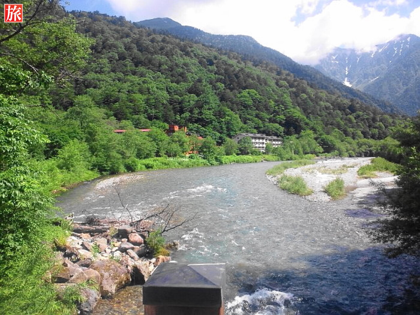 河童橋から上流方向を望む。橋を渡ると河童の休憩所と上高地白樺自然学校があります。ここからの風景が素晴らしい。