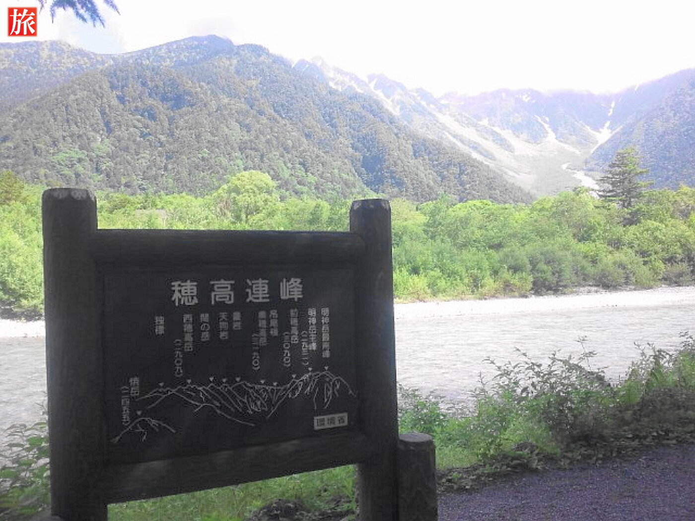 穂高連峰の案内板。穂高連峰の風景。河童橋が見えてきました。