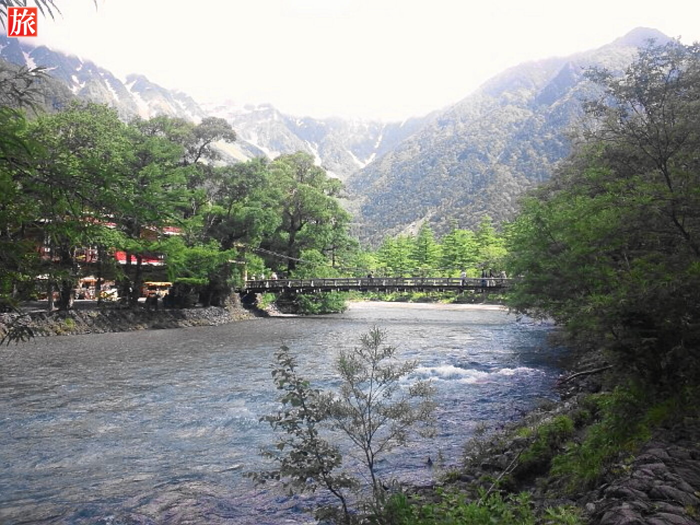 美しい穂高連峰。カッパのグッズが沢山!河童橋上の様子です。