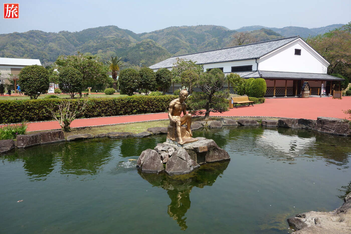 土肥金山の説明。金山奉行堂:1370年代、足利幕府直轄の金山奉行が土肥を支配し、盛んに金を掘ったのが、その始まりと伝えられています。池の真ん中に飾られた金の鉱夫「黄金の夢石像」