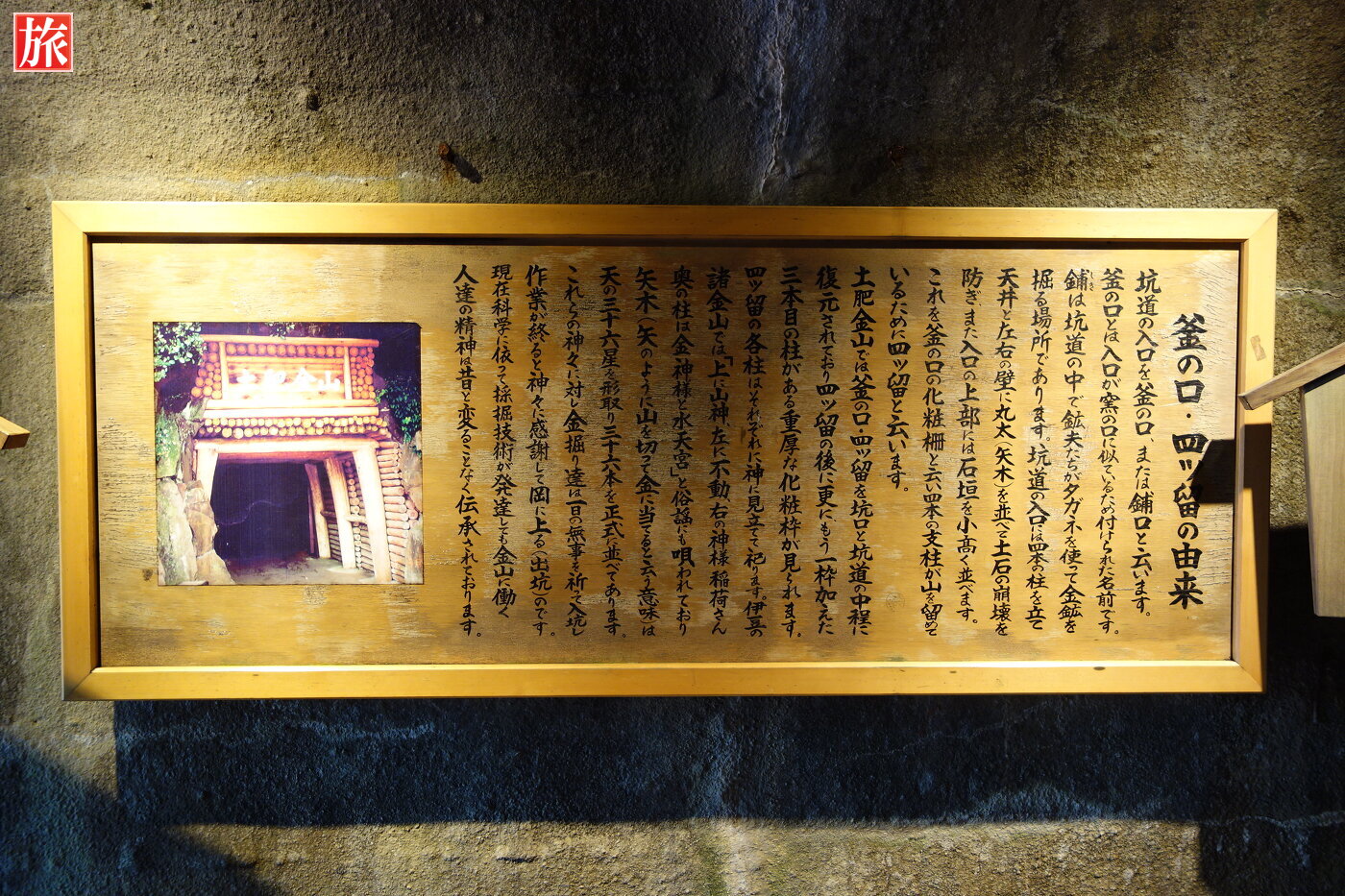 坑内入口。釜の口・四ツ留の由来。坑内作業は一十日(ひととうか)の説明板。