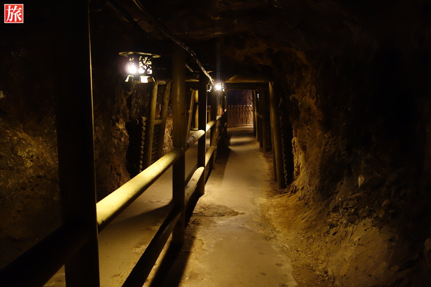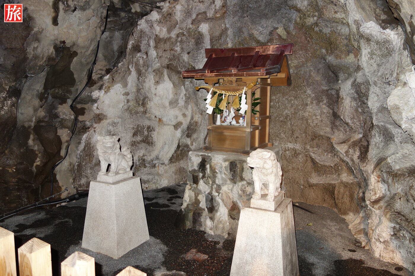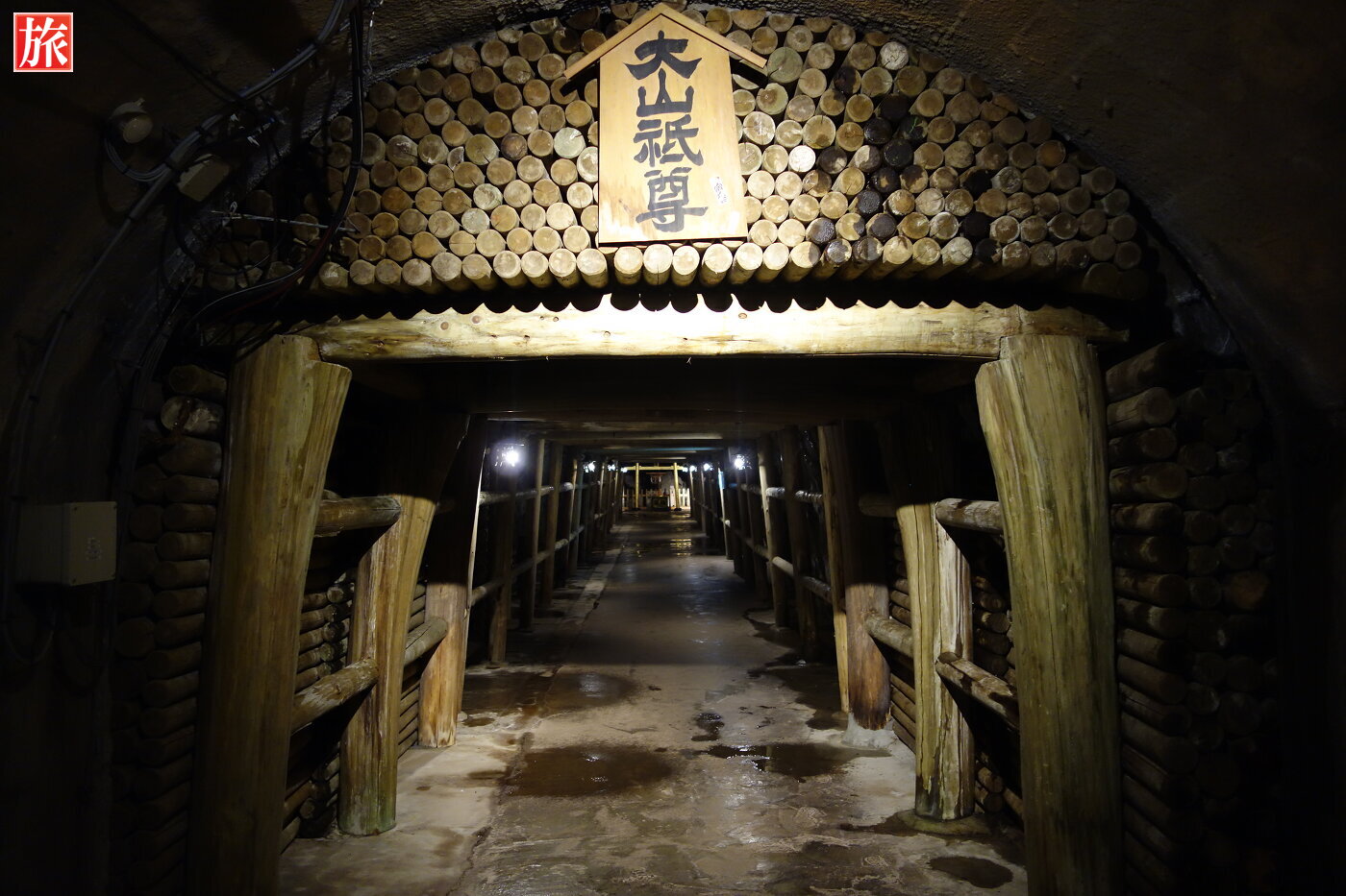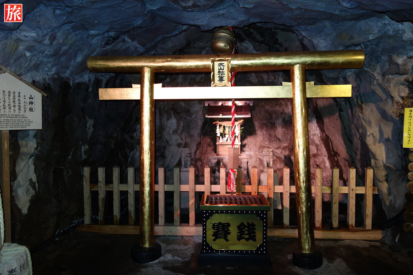 観光坑道を入ってしばらく歩いた突き当たりに「山神社(さんじんじゃ)」があります。ご祭神は大山祇尊(おおやまずみのみこと)で山の神様です。全部金箔で覆われている鳥居が目印。坑内に出入りする際に、礼拝して作業の安全と黄金の幸を祈るしきたりがあったそうです。金運がアップするパワースポットだと言われています。