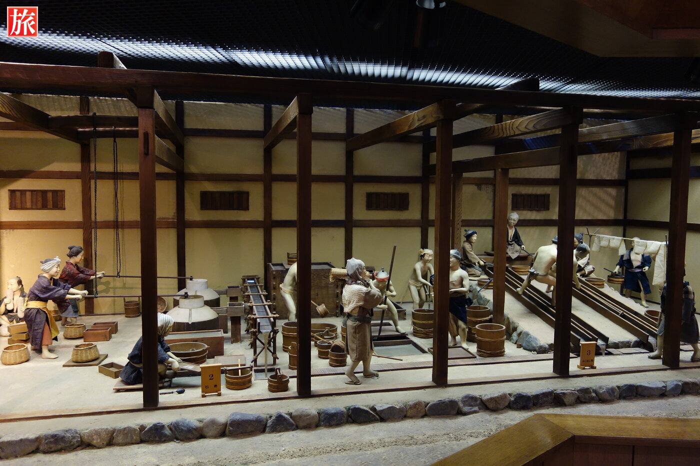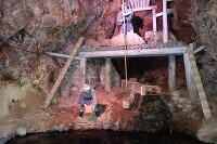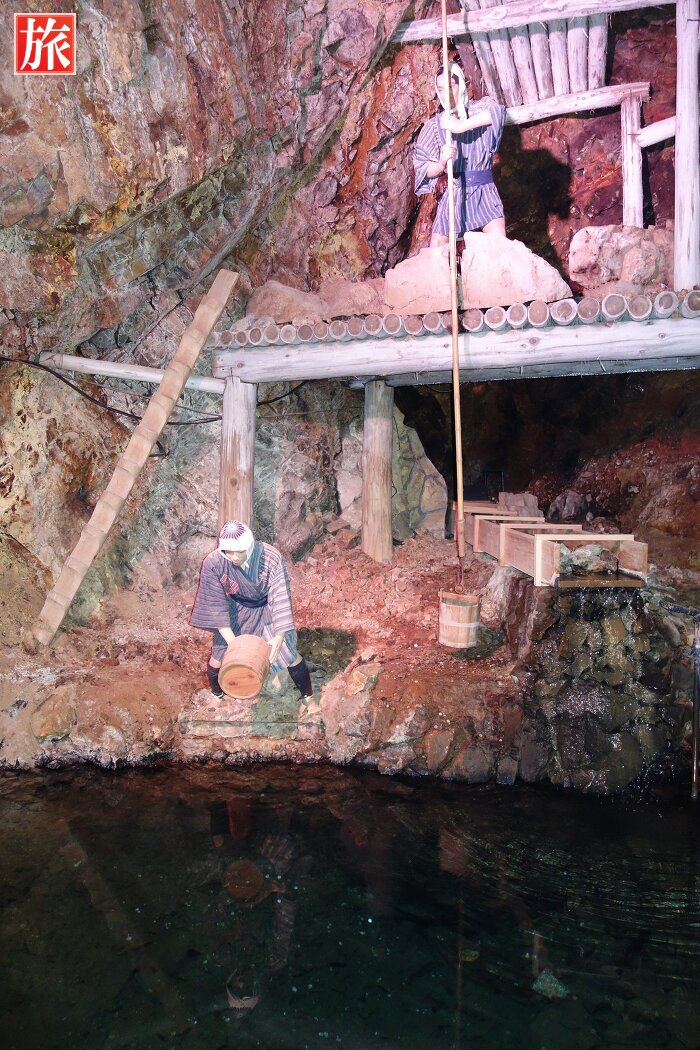 坑道内の気温は年間を通して約19度-22度で冬は暖かく夏は涼しく感じられるようです。手繰り水替の様子。湧き出た地下水を昼夜を問わず休み無く汲み上げていたそうです。