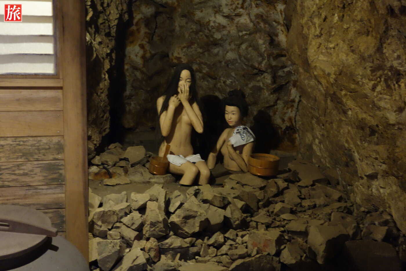 採掘の様子。坑道の様子。湧き出た温泉を利用したお風呂を再現。坑内風呂の説明。
