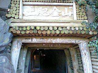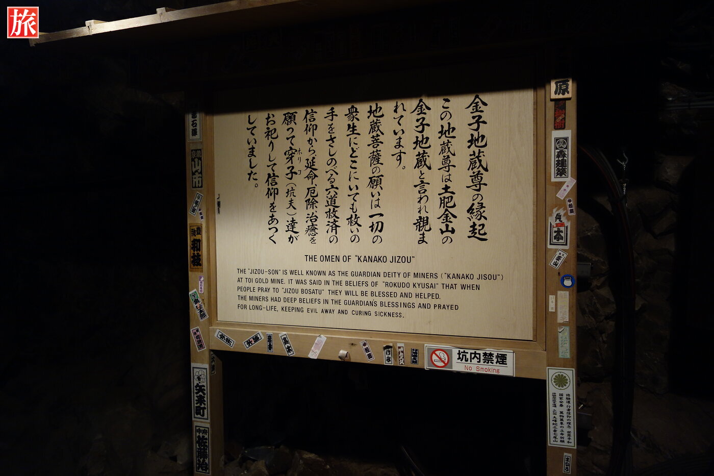 金子地蔵尊とその説明。坑道の出口付近に金鉱脈を掘り始めた跡が残っています。
