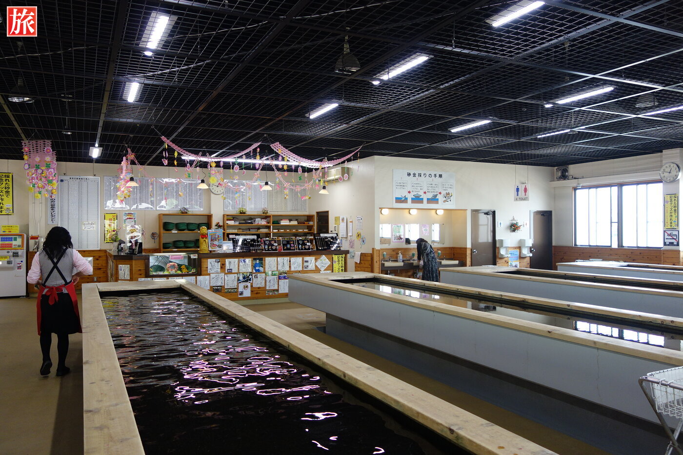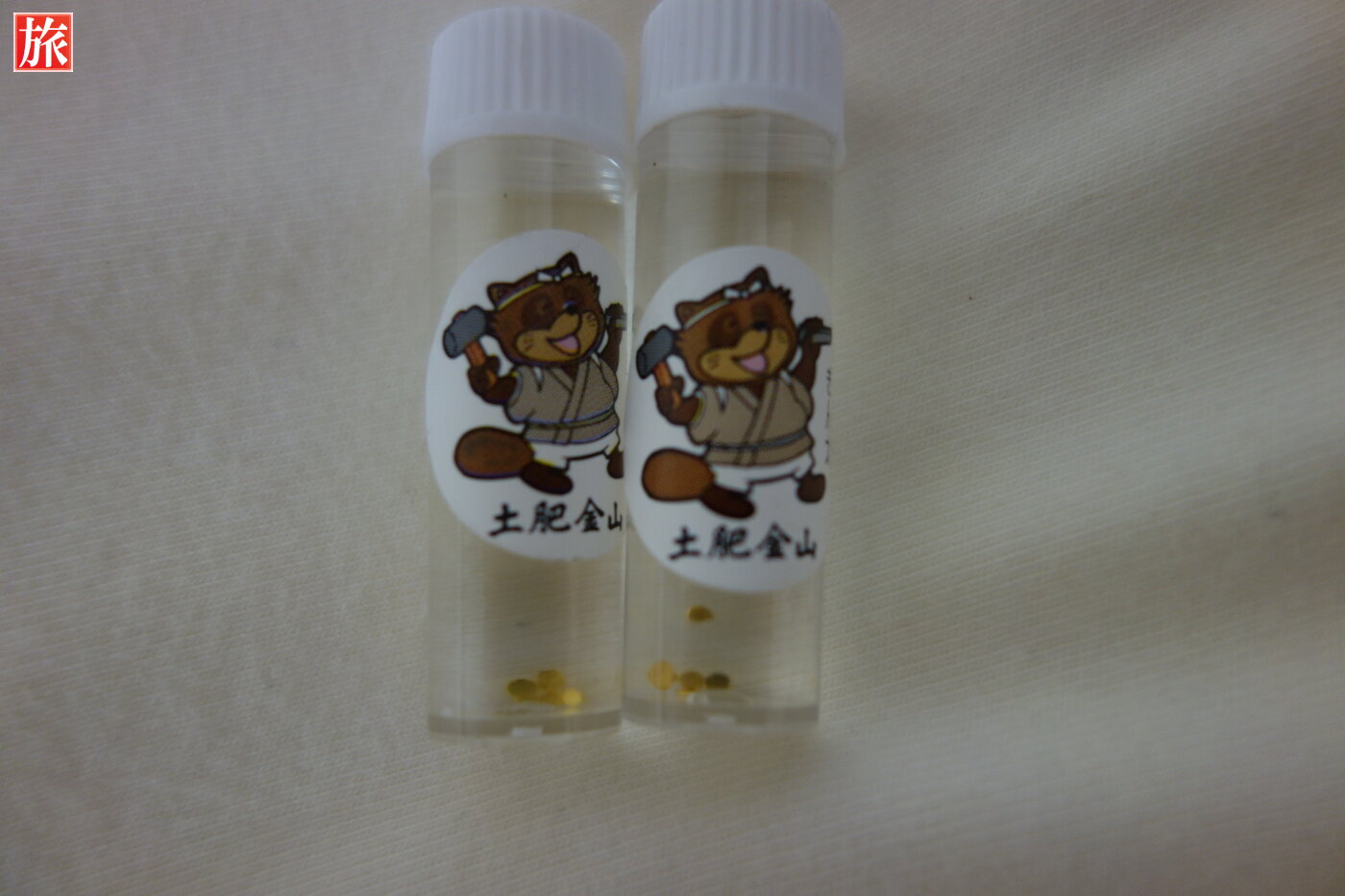 砂金採りは、大きな温泉が入った水槽に皿を入れ砂をすくい、温水の中で皿を回して余分な砂を流すと最後に段になった所に砂金が残る...という感じで採ります。取れた砂金(体験料金に含む)は小さなボトル(体験料金に含む)に入れキーホルダーやペンダント(有料1000円程度)に加工できます。