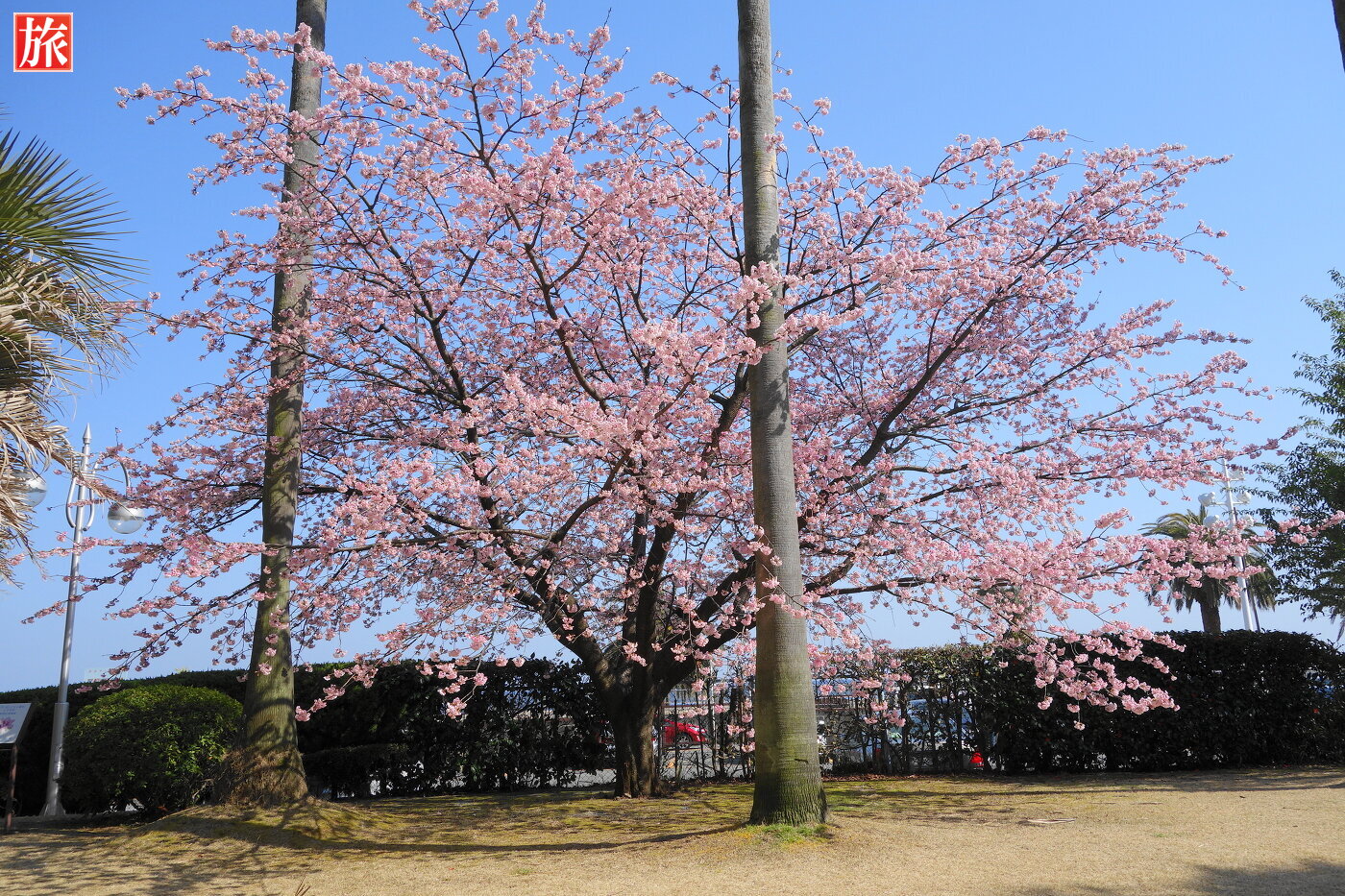 お宮の松。現在の「お宮の松」を二代目とのことです。満開の大寒桜。
