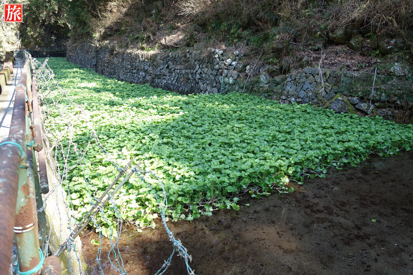 沢に沿ってワサビの栽培をしています。ワサビ収穫作業風景。マス釣り場。
