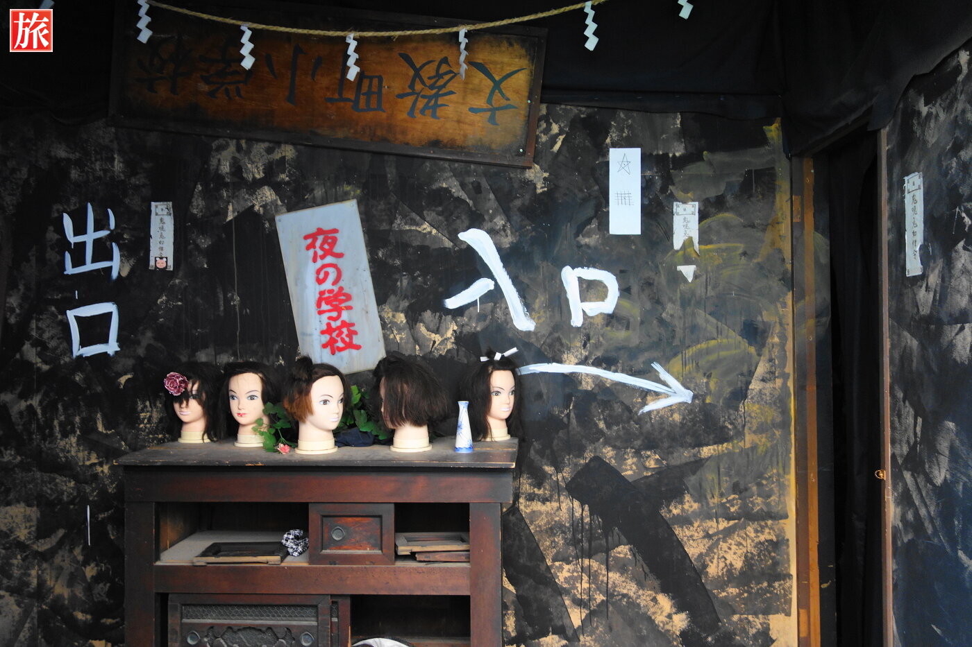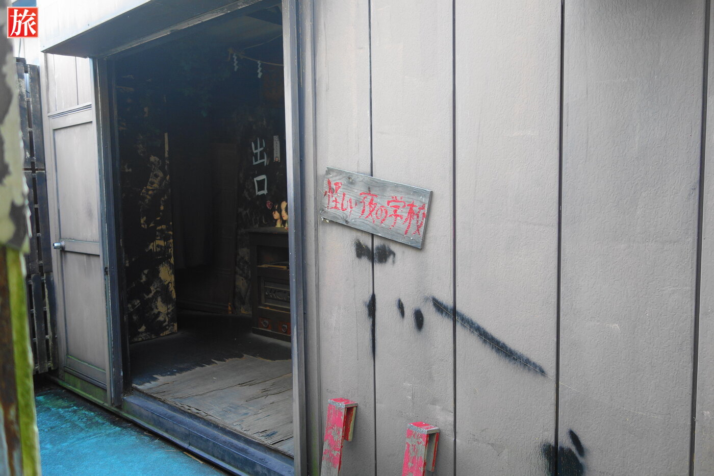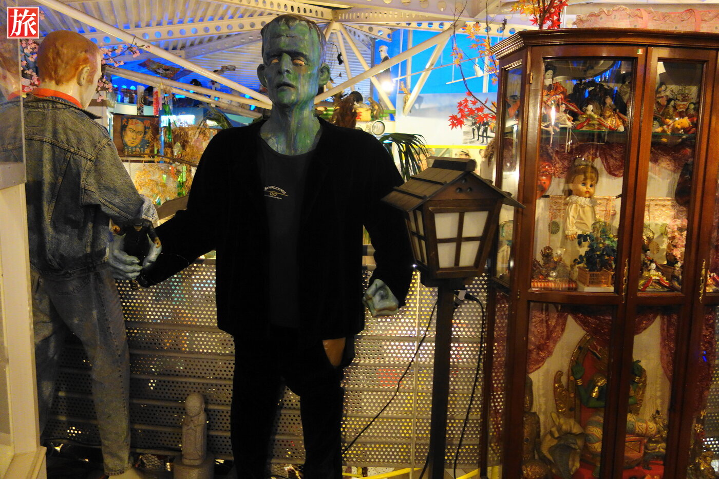 フランケンシュタインのフィギュア。建物の外に、怪しい夜の学校入口がありました。中はお化け屋敷になっています。突然動き出すお化けやドライヤーの風が吹き付ける・・・規模は小さく一般的なお化け屋敷・・・