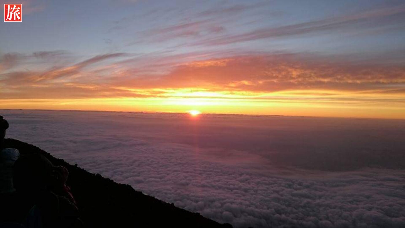 登っている間ほとんど小雨が降っていましたが、七合目以降眼下に雲海が広がり壮大な眺めです。太陽が沈み始めると見事な影富士が現れました。