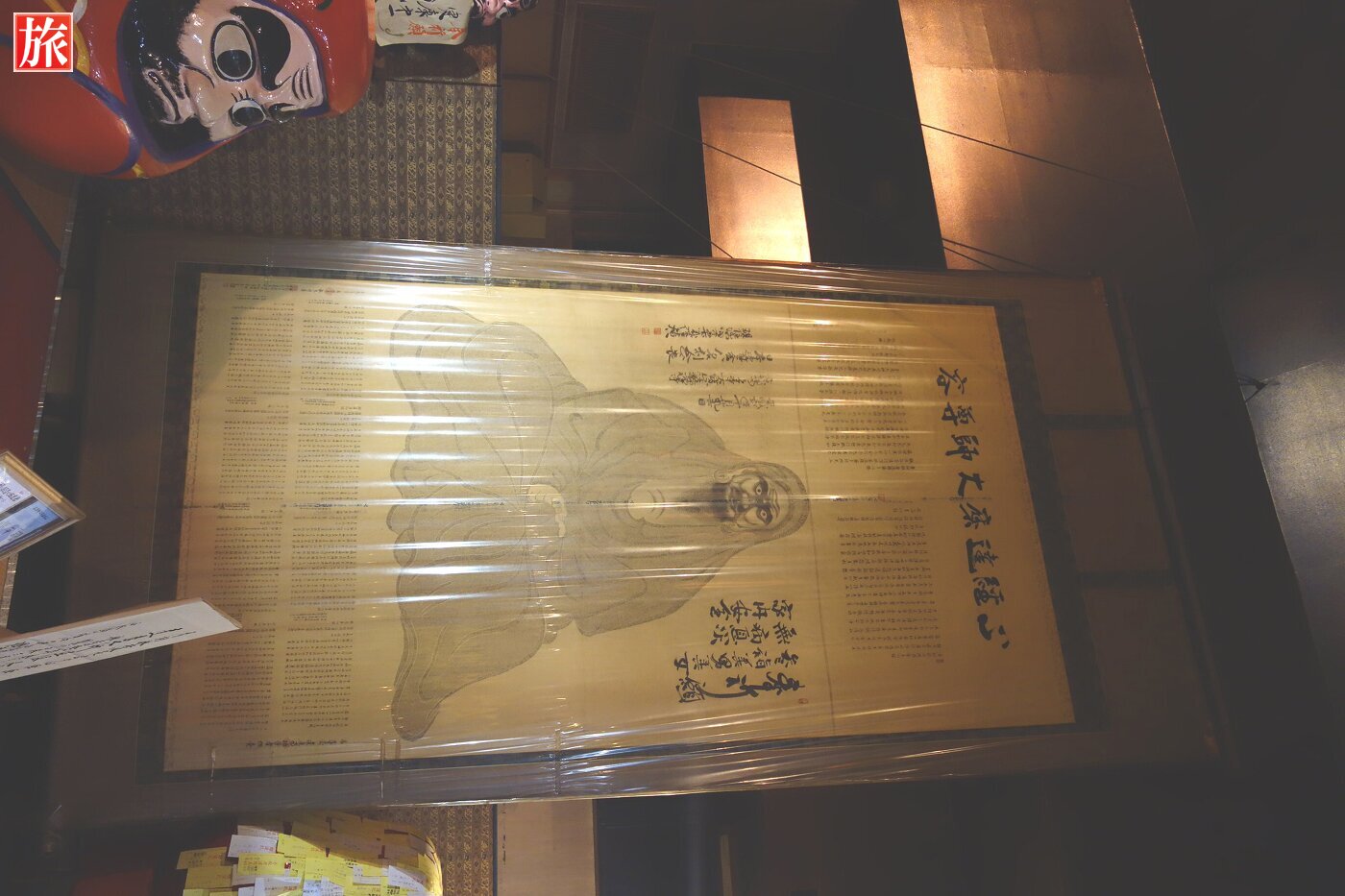 達磨大師像右手に極小文字で描かれた達磨大師がいました。この極小文字は「般若心行(はんにゃしんぎょう)」を写経したもので、経文を書いたものです。燈舟(山本泰宏)氏が3年5ヶ月費やし、約24万文字を書き上げたものとのこと。