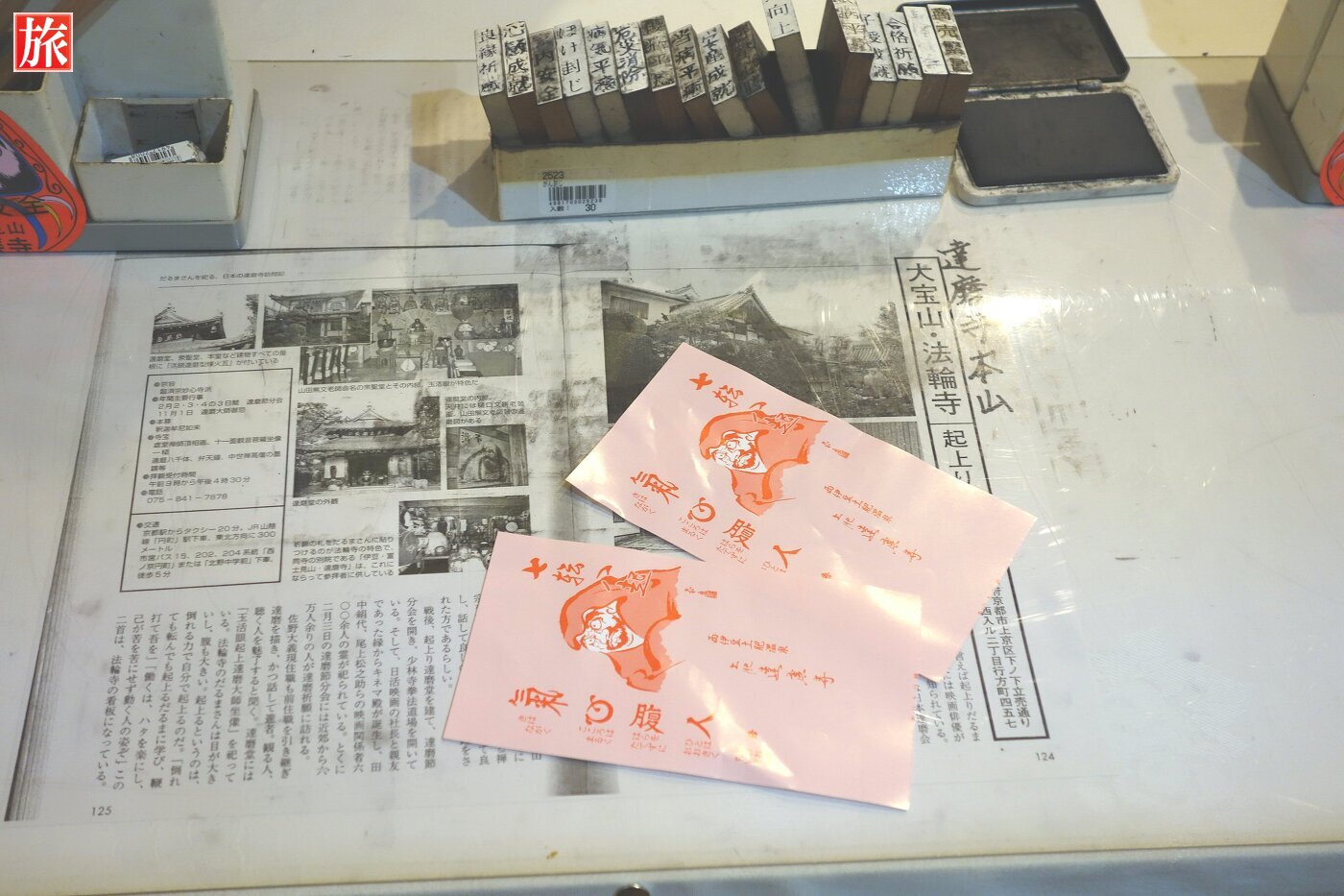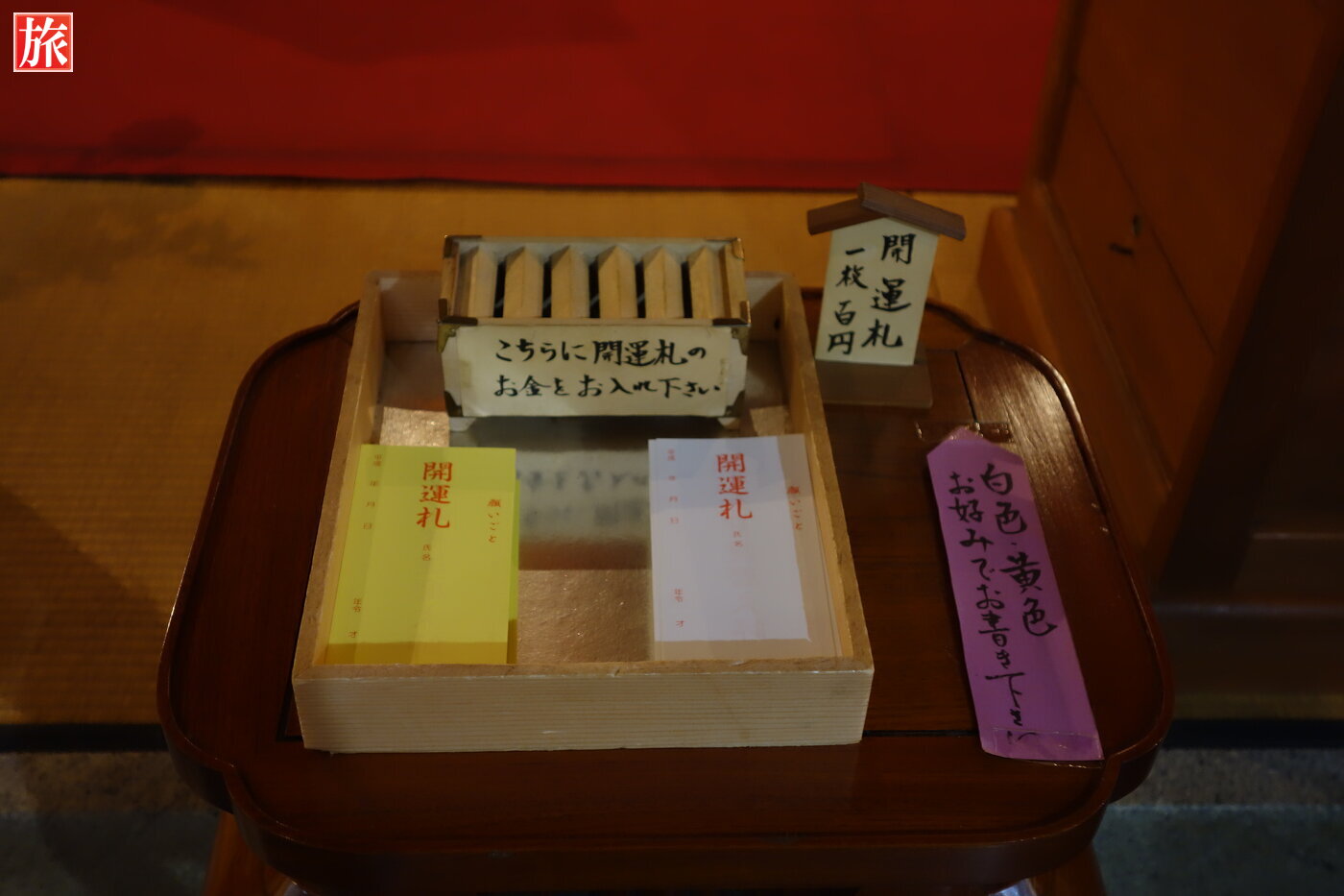 開運札(1枚100円)にひとつ願い事を書いて、宇宙創世発展の5大要素(火・風・空・地・水)を5色に表した五色願懸け達磨に張り付けたら、太鼓を1回叩き、「南無達磨婆婆訶」(なむだもそあか)と3回唱え祈願します。こちらの五色願懸け達磨は「京だるま」で目の中心が金色。その回りを囲むように黒く塗って瞳を完成させています。