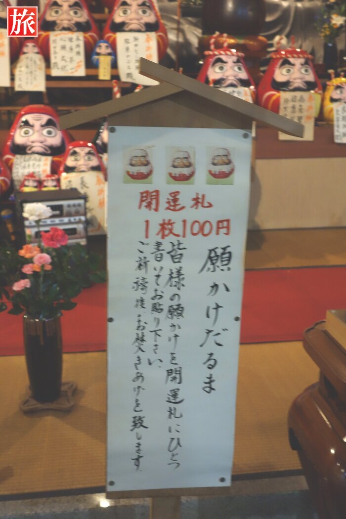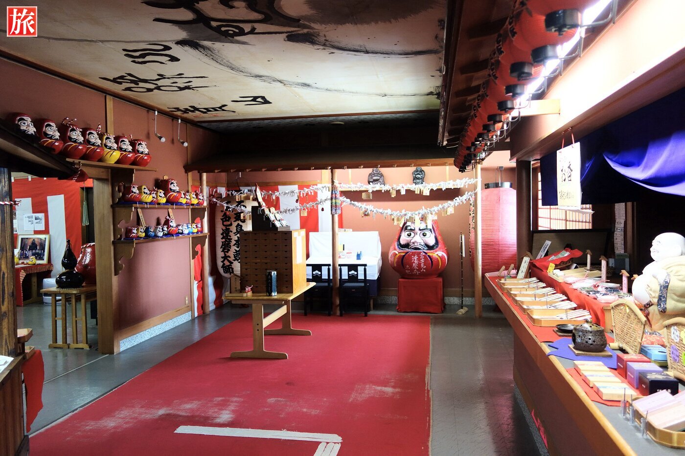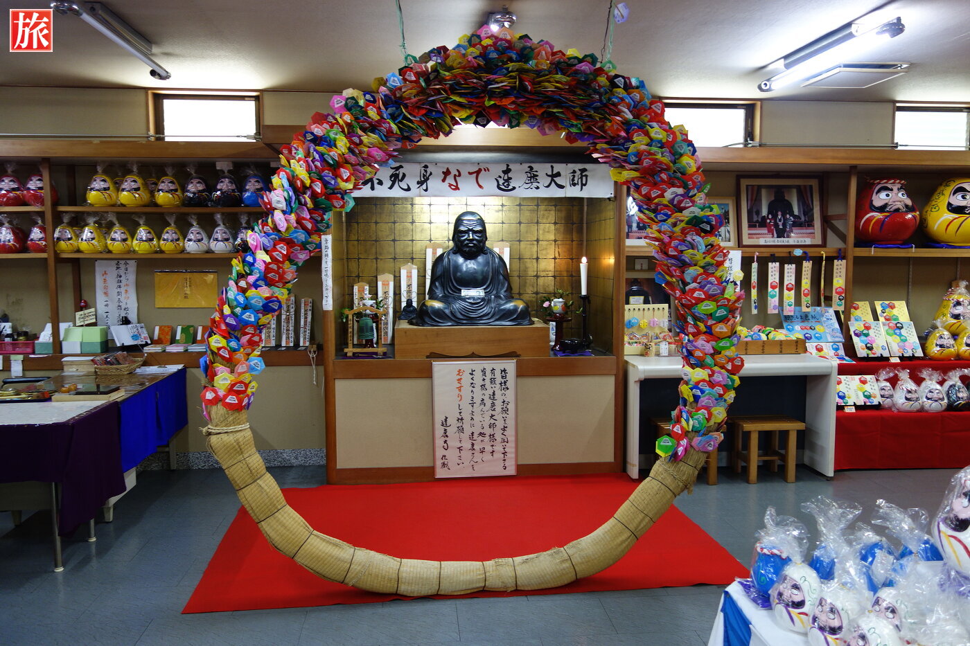 本堂から出ると、だるま屋があり「なで達磨大師」(輪くぐり達磨)があります。祈願方法は輪をくぐり病んでいるところ撫で、達磨大師の横の小さな金を1回鳴らして健康祈願します。その後輪をくぐらずに左に抜けます。