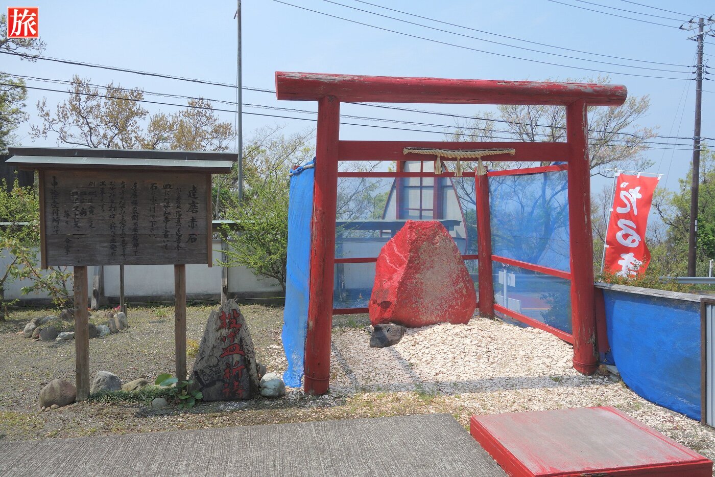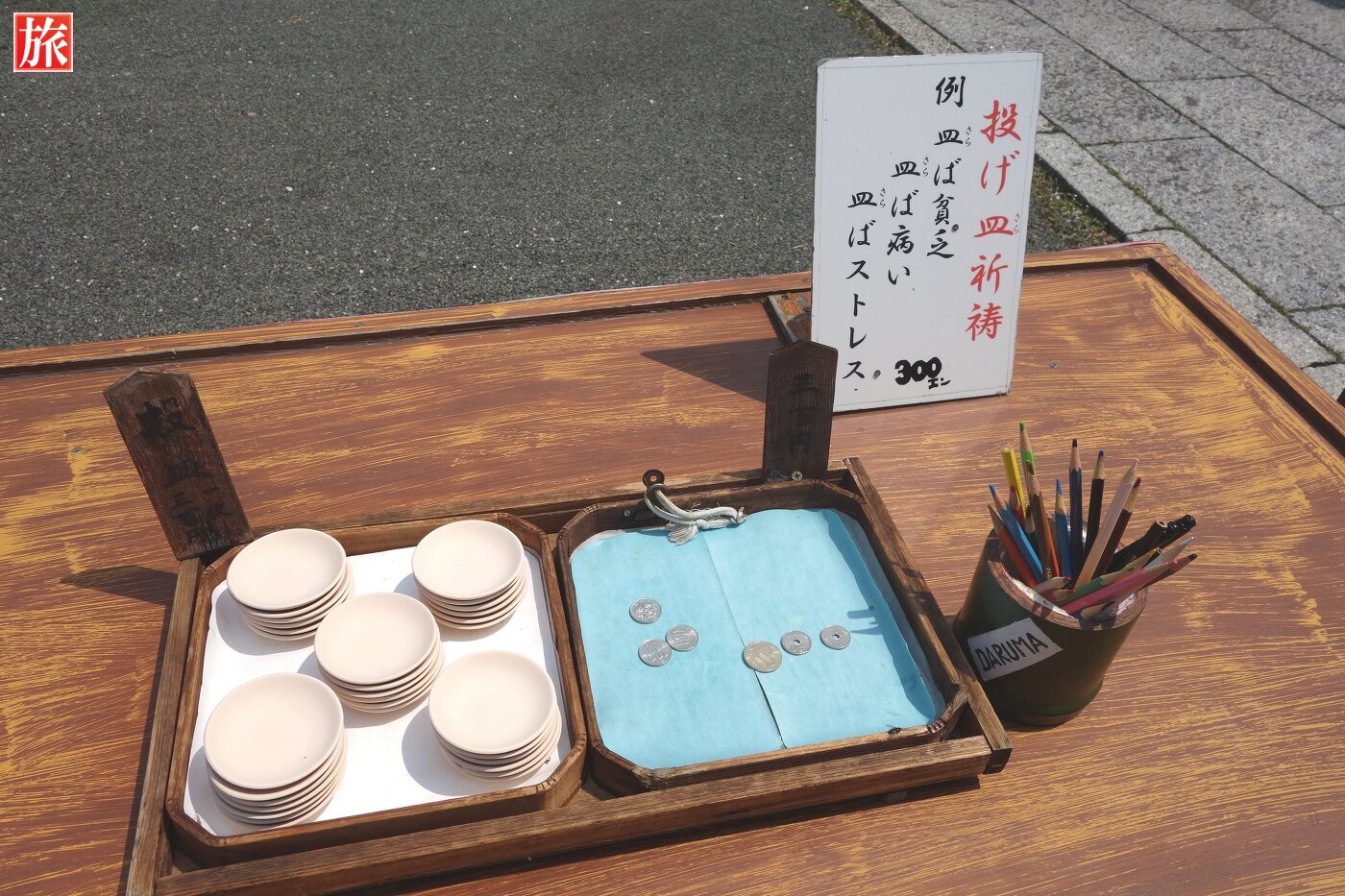 だるま屋から外に出て「投げ皿祈祷」をしに境内に向かいます。赤い鳥居の先に大きな赤い石があり、そこに悩み事を書いた皿を投げつけ、皿が粉々に!気分スッキリ、お皿とともに「おさらば」。