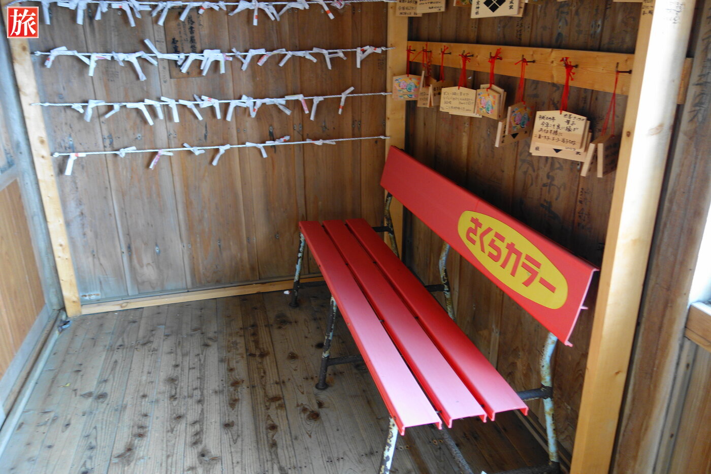 大きな干支の絵馬と龍の絵馬が飾ってありました。なにげにあった赤いベンチ。