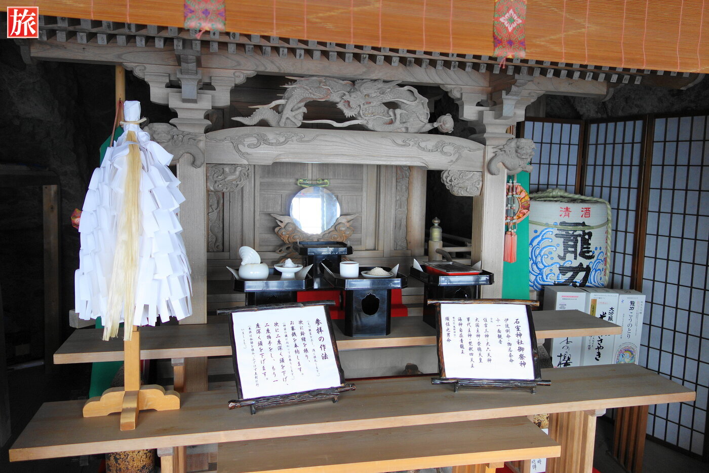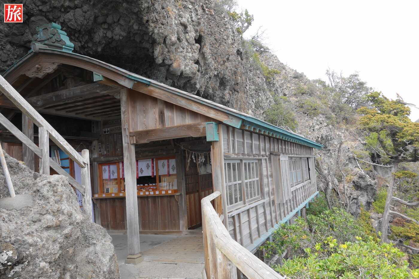 観光ルート 石廊崎レポートTOP > 石廊埼灯台 > 石室神社 > 石廊崎 熊野神社切り立った断崖絶壁の小さなくぼみにある神社です。海上安全や縁結び・商売繁盛・交通安全・厄除けの神様が祀られています。社殿が千石船の帆柱を枕に建てられていることから。伊豆七不思議のひとつで「石廊崎権現の帆柱」の江戸時代から伝わる伝説の舞台でもあります。5世紀ごろ石室山金剛院として建立されたのが始まりだといわれる古い神社。