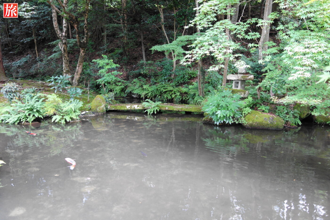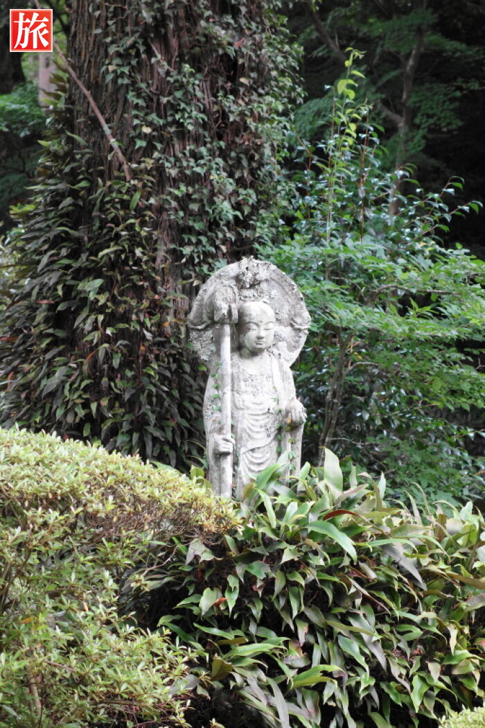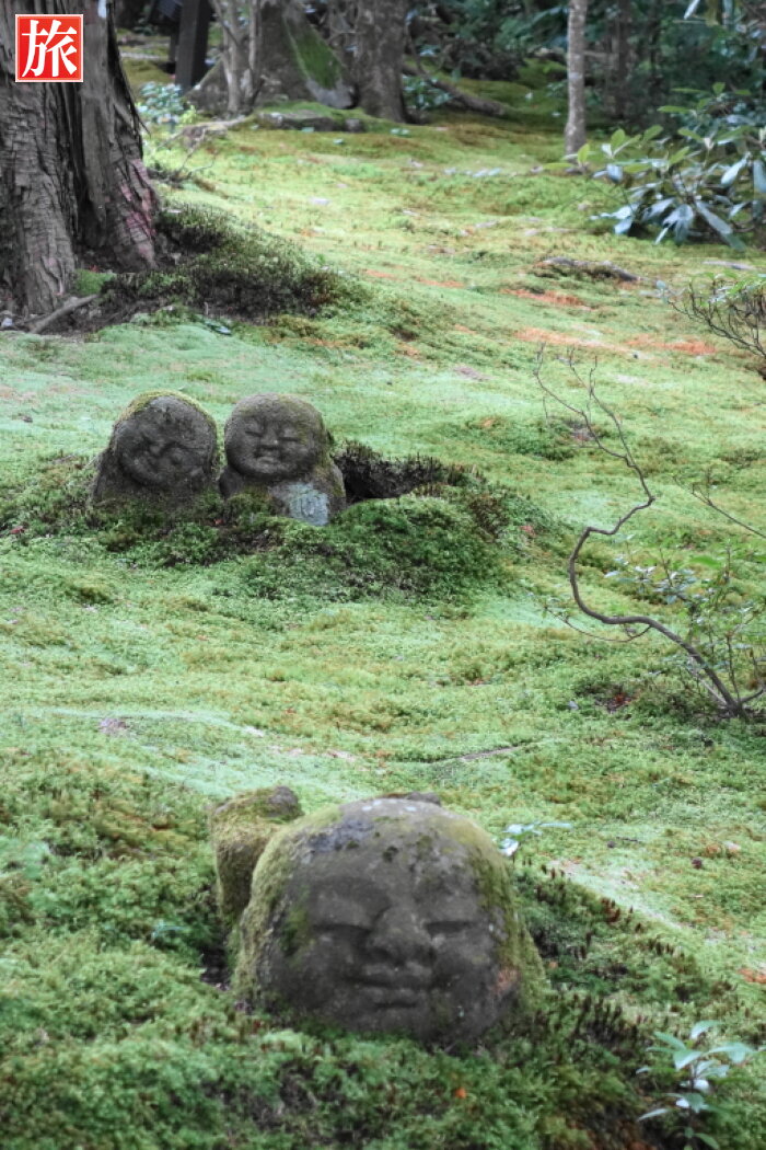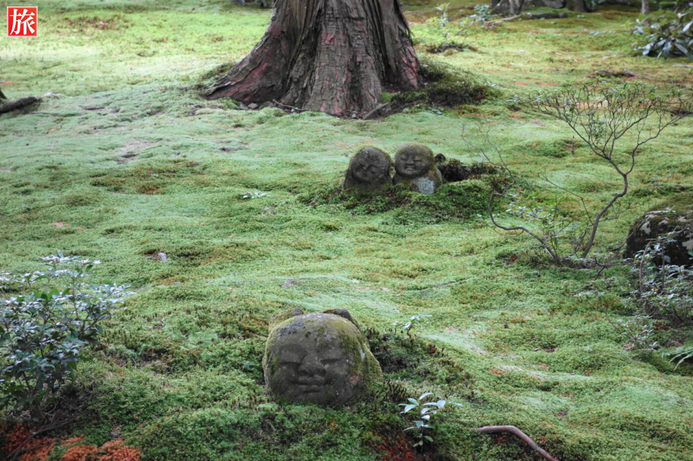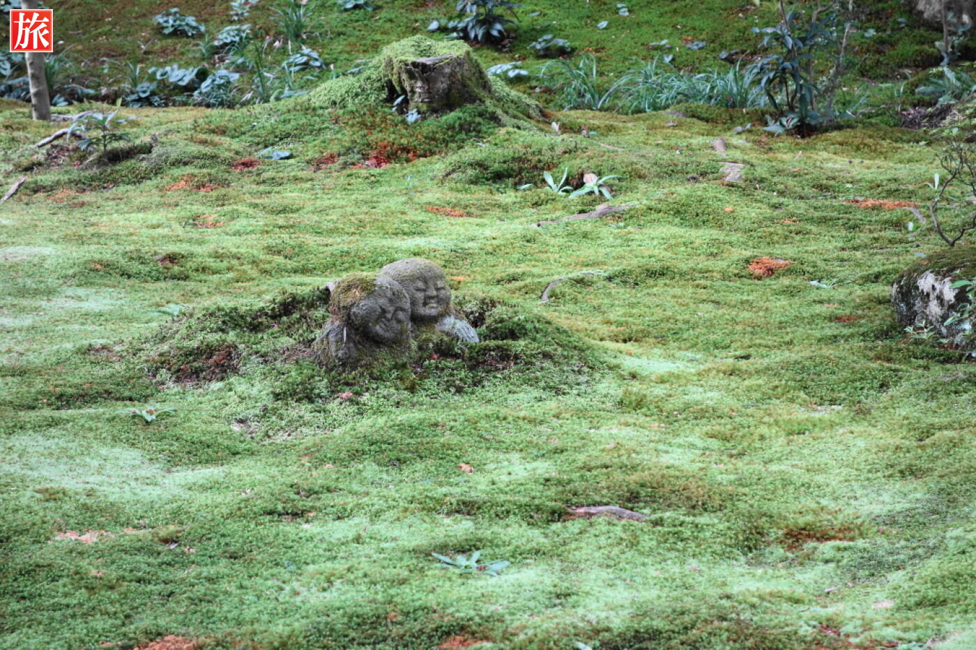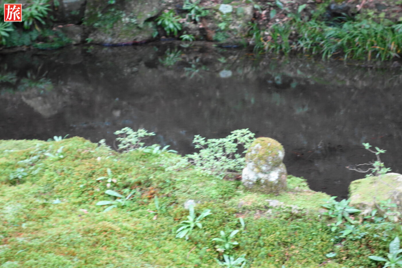 一面青苔に覆われ、瑠璃光庭とも呼ばれます。お地蔵様。池と滝もありました。