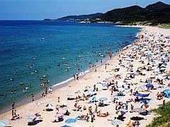 日本最大の鳴き砂の浜、日本の渚100選、日本の音風景100選 に選ばれている。波打ち際の乾いた砂をこするように踏みしめて歩くと、キュッキュッと琴のような音がする鳴き砂の浜。夏は海水浴場として賑わう。
