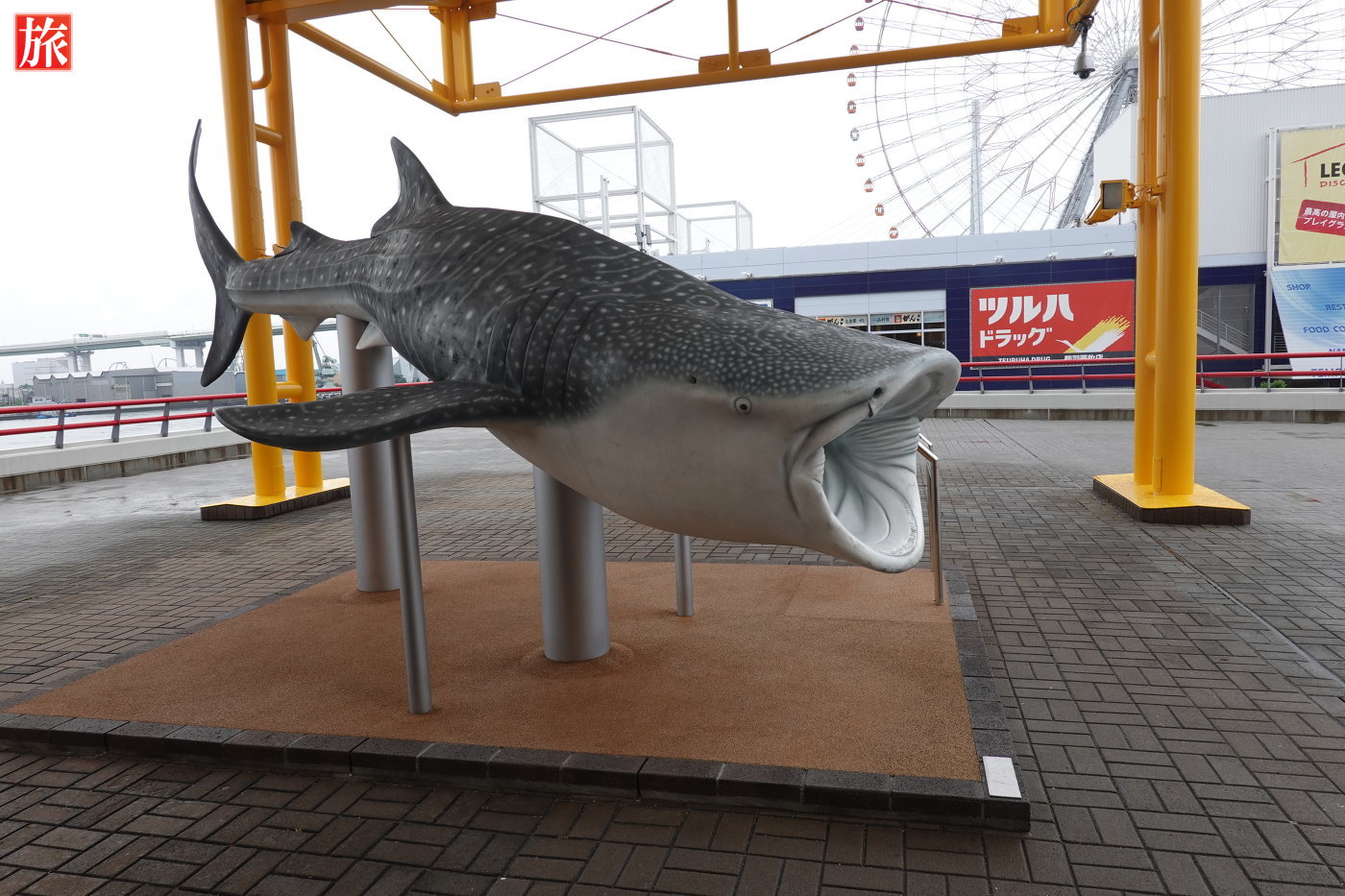 迫力のジンベエザメ・モニュメント。エスカレーターで下り日本の森へ。滝やらサワガニなど