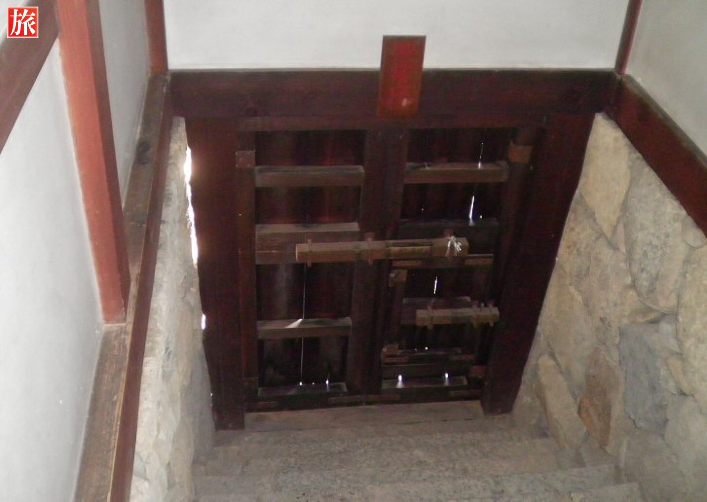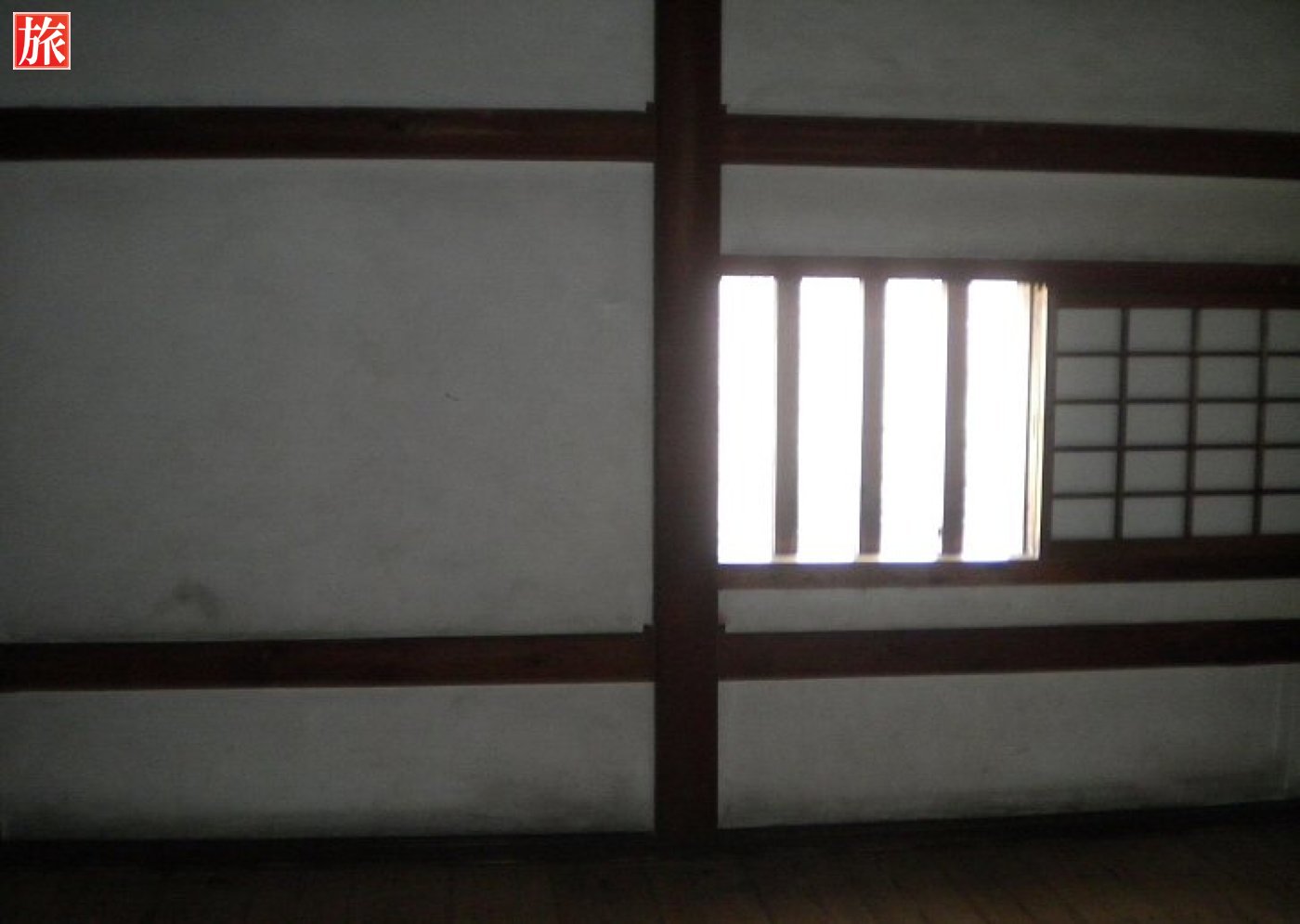 塀に穴が開いています。狭間(さま)、長方形は矢狭間、正方形三角形円形は鉄砲狭間です。