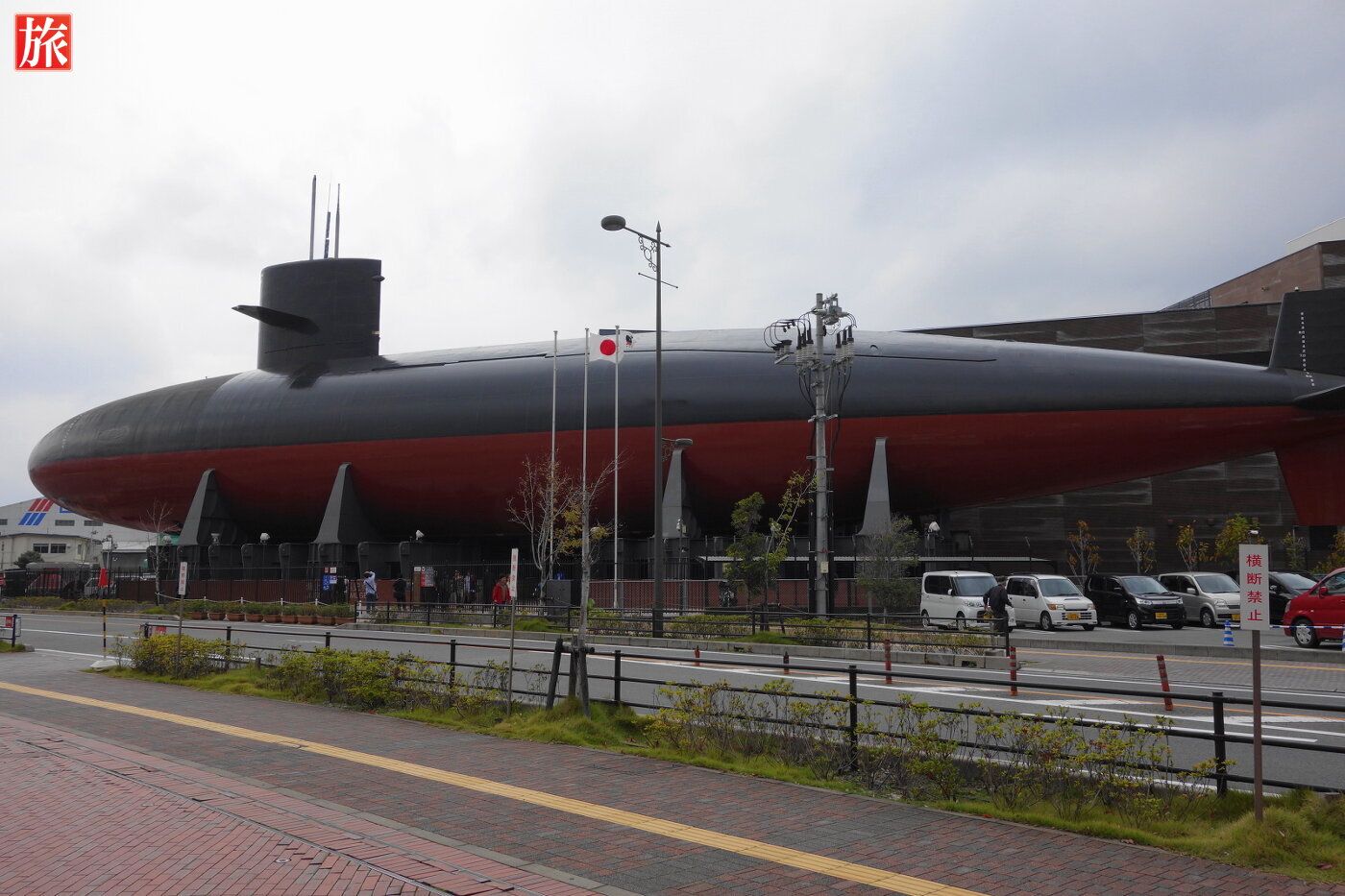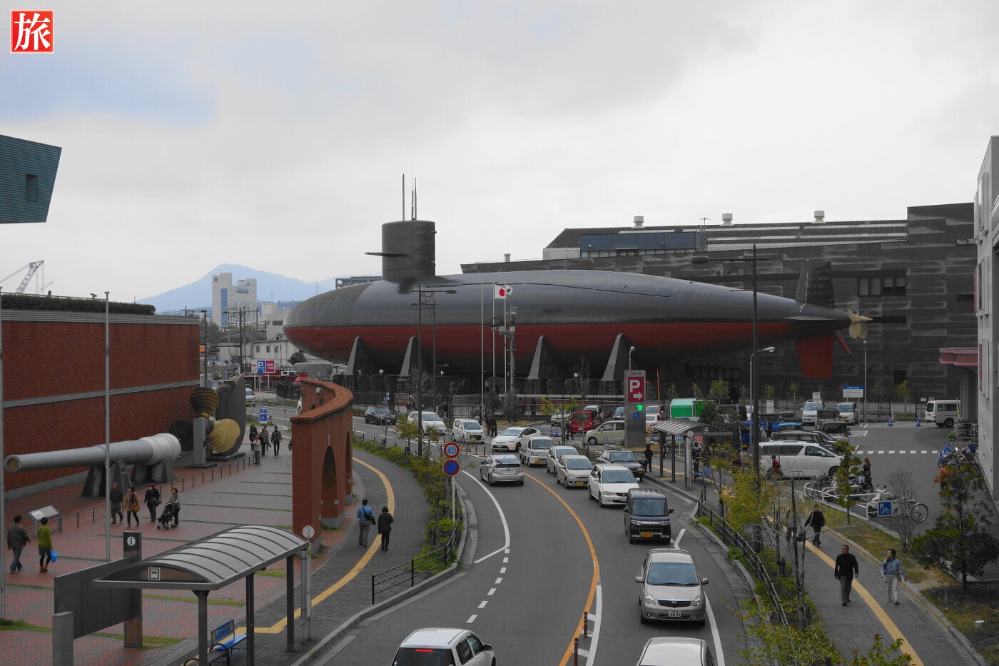 ゆめタウン呉を突っ切るように進むと正面に呉市海事歴史科学館「大和ミュージアム」が見えてきます。右手には海上自衛隊呉史料館 てつのくじら館が見えます。潜水艦あきしおが目印になっいます。
