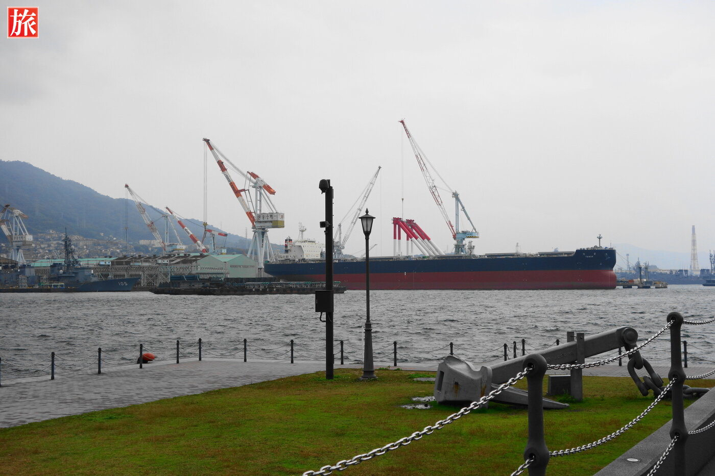 呉港を一望できます。かつて戦艦「大和」を生み出したドック跡や、巨大なタンカー、行き交う船など、呉らしさを感じることができる景色です。