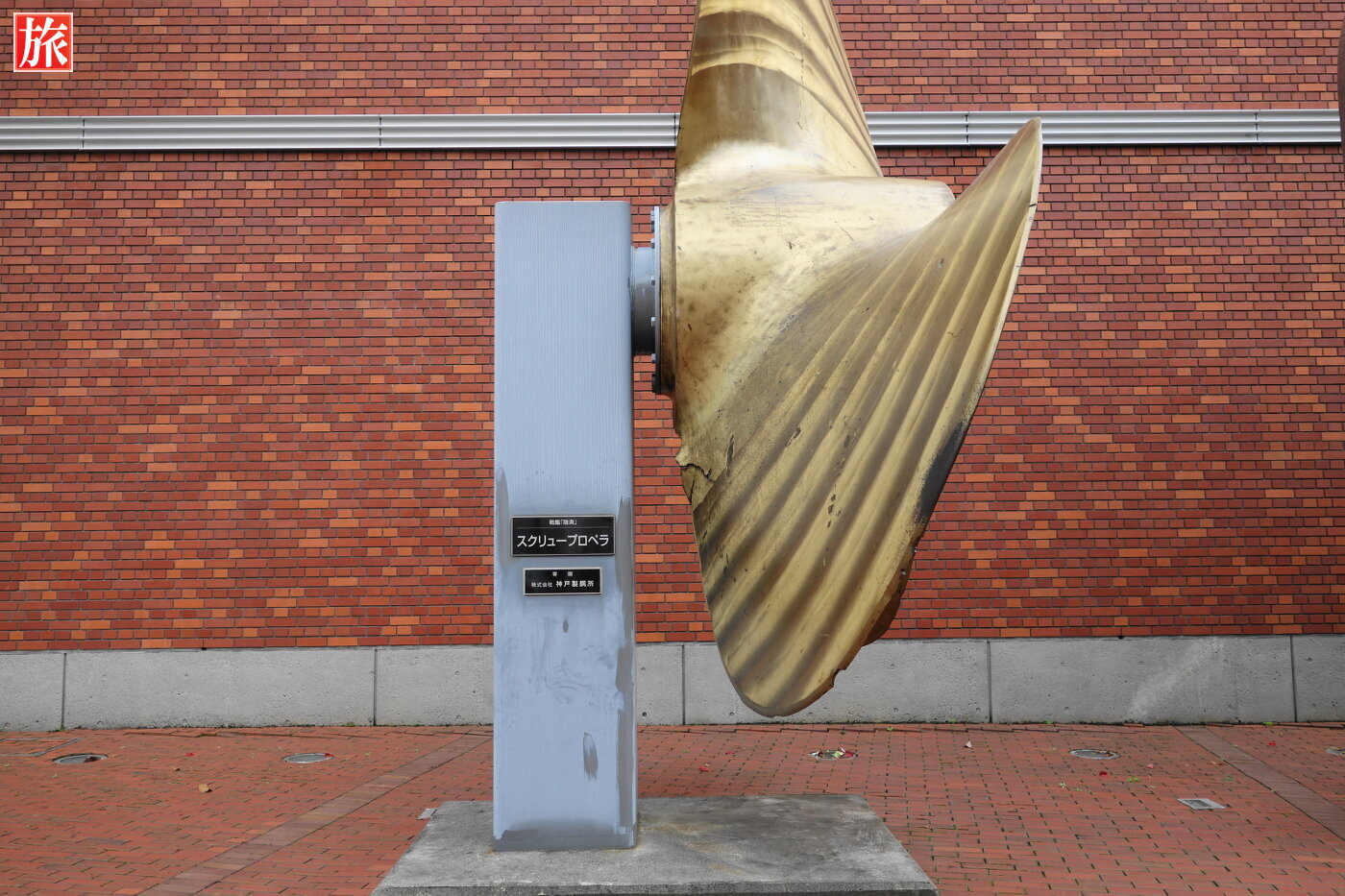 駐車場からエントランス間のレンガパークの様子です。戦艦「陸奥」の主砲身、スクリューの引揚品です。