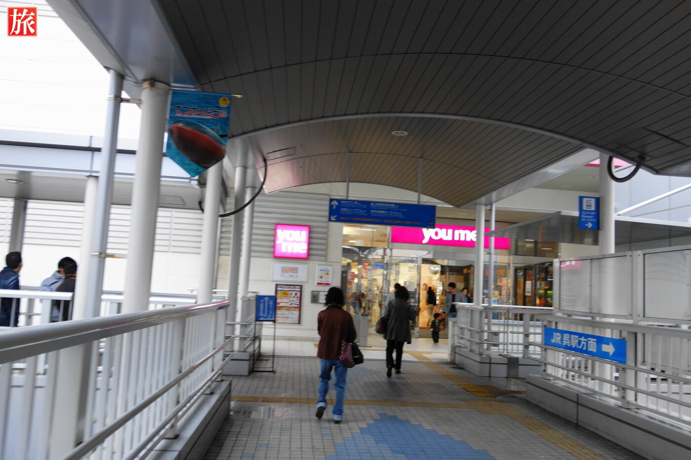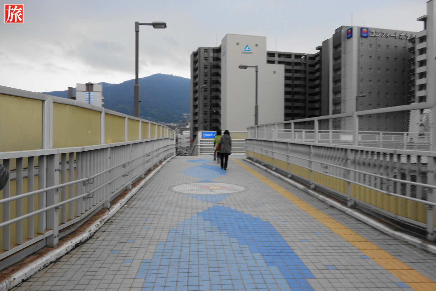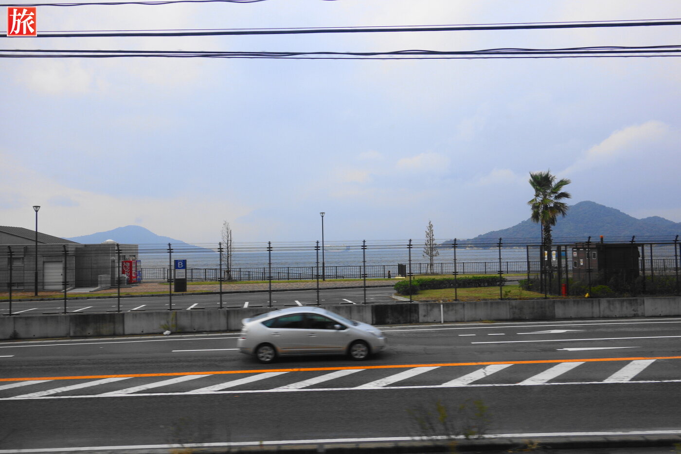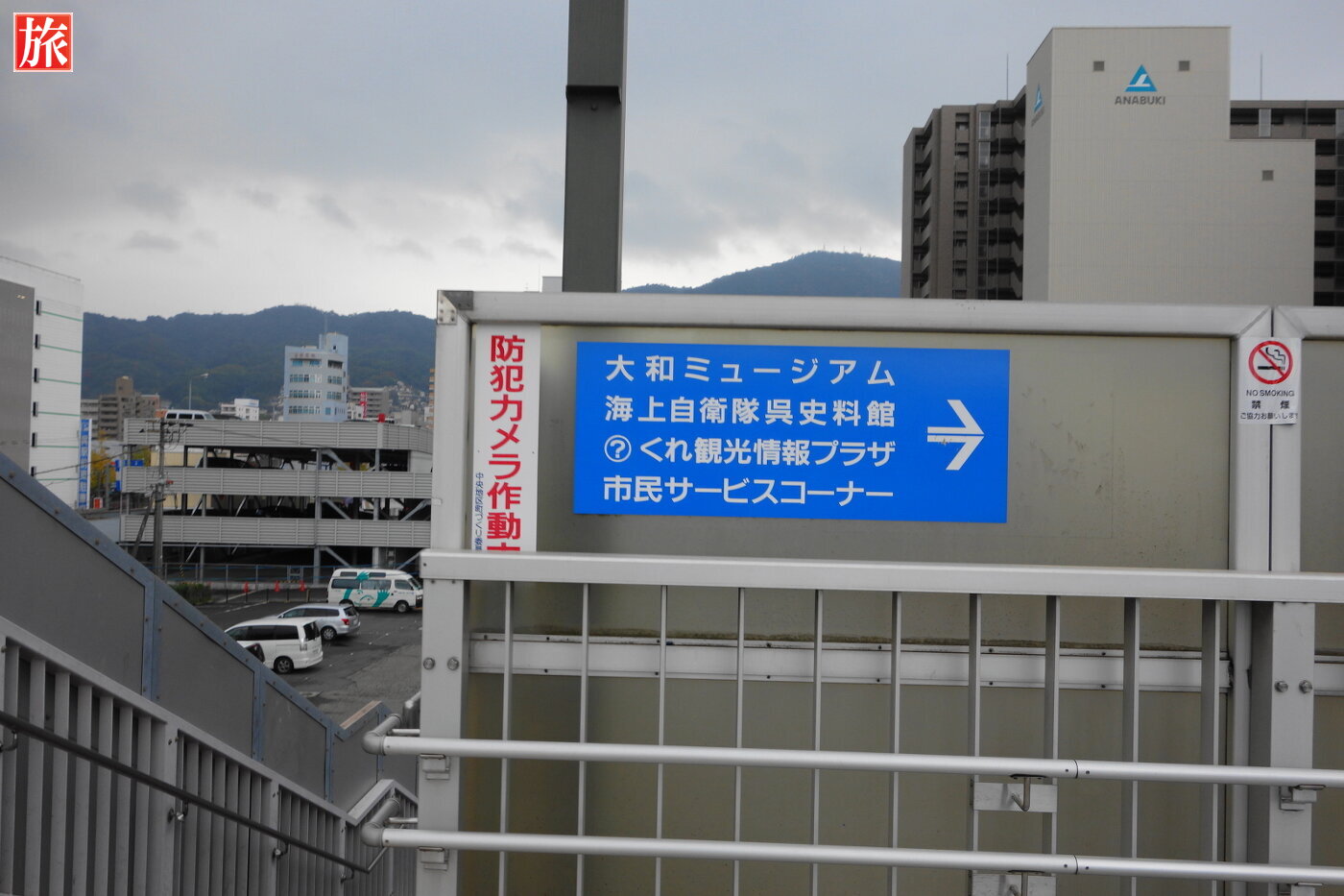 広島から呉へ向かう車窓から海を眺めた風景です。呉駅に着きました。横断歩道を案内標識の通り進みます。